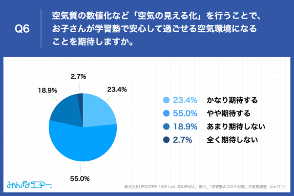 「Q6.空気質の数値化など「空気の見える化」を行うことで、お子さんが学習塾で安心して過ごせる空気環境になることを期待しますか。」(n=111)と質問したところ、「かなり期待する」が23.4%、「やや期待する」が55.0%という回答となりました。