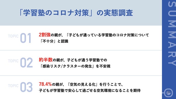 今回の調査で、子どもを学習塾に通わせている親は、「塾は感染対策を頑張ってくれている」とは思いながらも、学習塾での「感染リスク/クラスターの発生」を不安視している現状が明らかになりました。寒い季節に窓を開けながら授業を実施することに対して心配する声も挙がったように、厳しい感染症対策が必ずしも有効とは言えません。子どもが学習塾で安心して過ごすことのできる空間を実現するためにも、「空気の見える化」が求められているといえるでしょう。