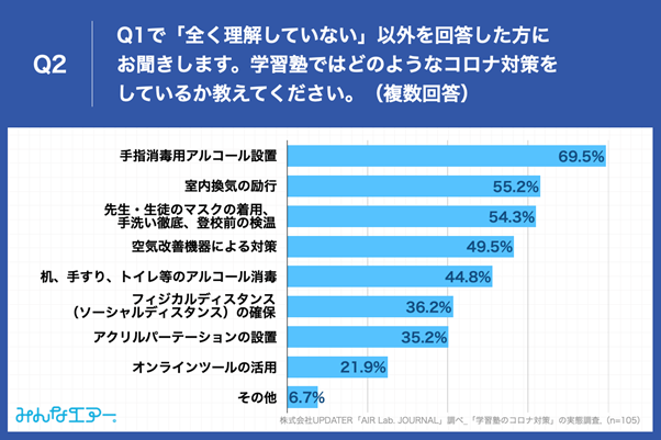 「Q2.Q1で「全く理解していない」以外を回答した方にお聞きします。学習塾ではどのようなコロナ対策をしているか教えてください。(複数回答)」(n=105)と質問したところ、「手指消毒用アルコール設置」が69.5%、「室内換気の励行」が55.2%、「先生・生徒のマスクの着用、手洗い徹底、登校前の検温」が54.3%という回答となりました。