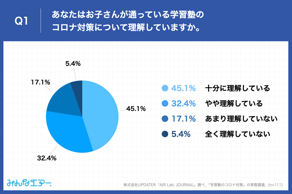 「Q1.あなたはお子さんが通っている学習塾のコロナ対策について理解していますか。」(n=111)と質問したところ、「十分に理解している」が45.1%、「やや理解している」が32.4%という回答となりました。