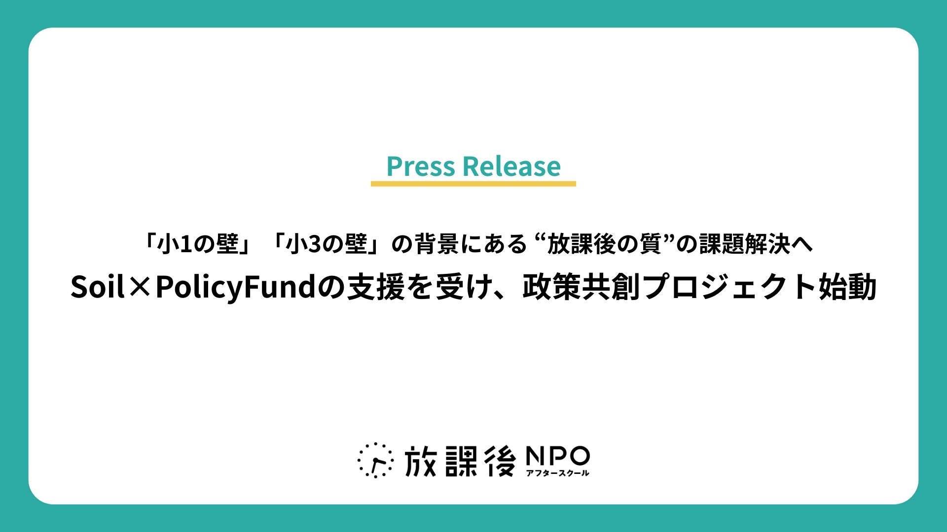 「日本中の放課後を、ゴールデンタイムに。」をミッションに活動する特定非営利活動法人 放課後NPOアフタースクール(東京都文京区、代表理事:平岩国泰/以下「放課後NPOアフタースクール」)は、公益財団法人Soil(東京都渋谷区、代表理事:久田哲史)と株式会社PoliPoli(東京都千代田区、代表取締役:伊藤和真)の共同企画「Soil × PolicyFund」の支援を受け、2026年4月より放課後の質向上に向けた政策提言プロジェクトを始動します。本プロジェクトは、放課後NPOアフタースクールの居場所づくりの実践と知見、国や自治体、全国の居場所など多様な連携基盤を活かし、これまでの政策提言活動をさらに発展させながら、政策共創と社会実装を推進する取り組みです。