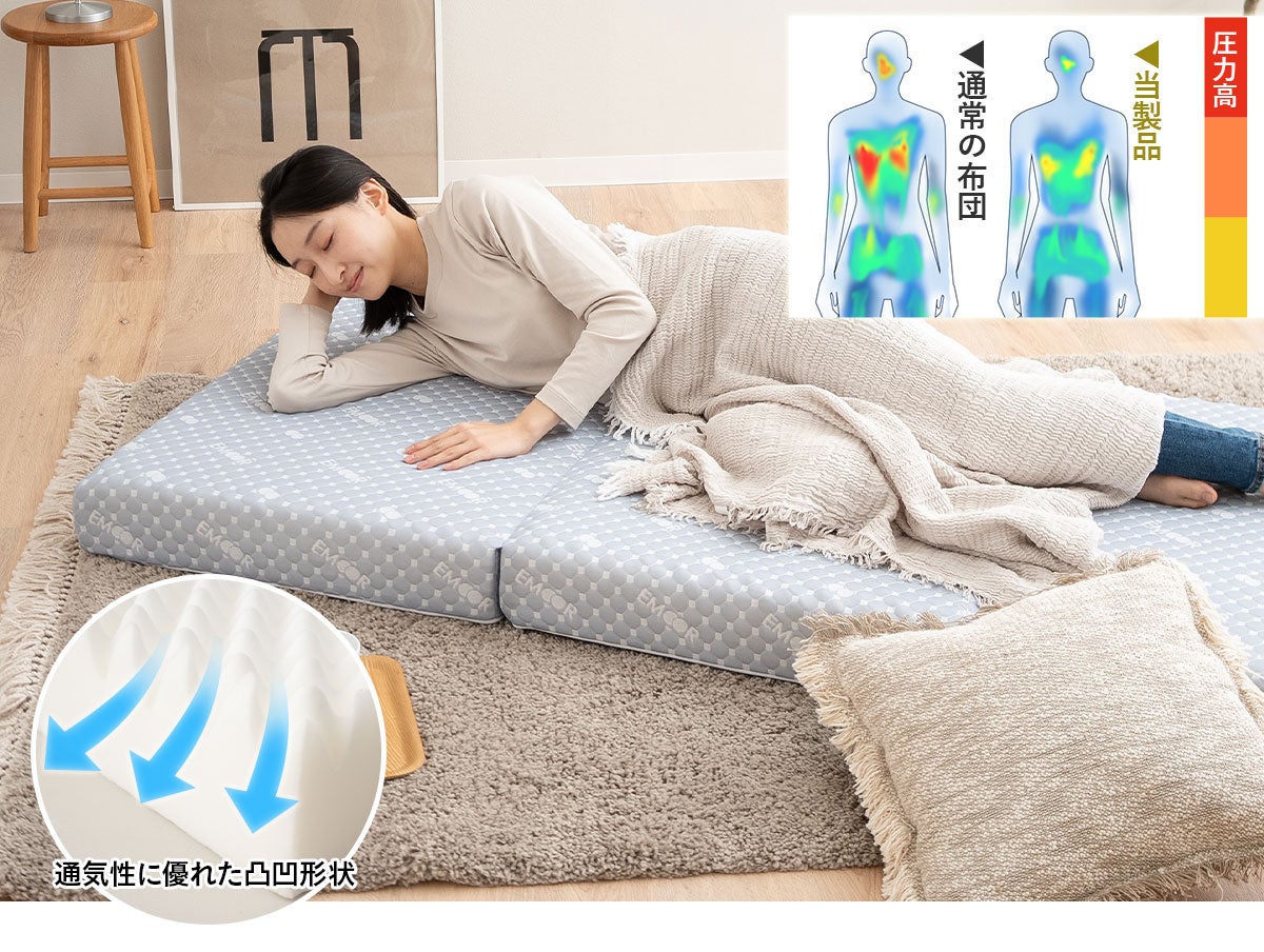 ウレタンの表面は凸凹(プロファイル形状)に加工。高反発で硬めのウレタンでも圧迫感が少なく、体圧分散性に優れたサポート性の高い寝心地をキープします。また、寝返りをするたびに空気が入れ替わるからムレにくくなります。