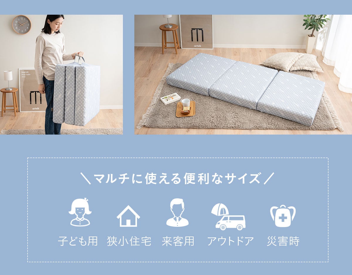 3つ折り仕様で、コンパクトになるので、お部屋にそのまま置いても邪魔になりません。また、取っ手がついているので、持ち運びにも便利です。