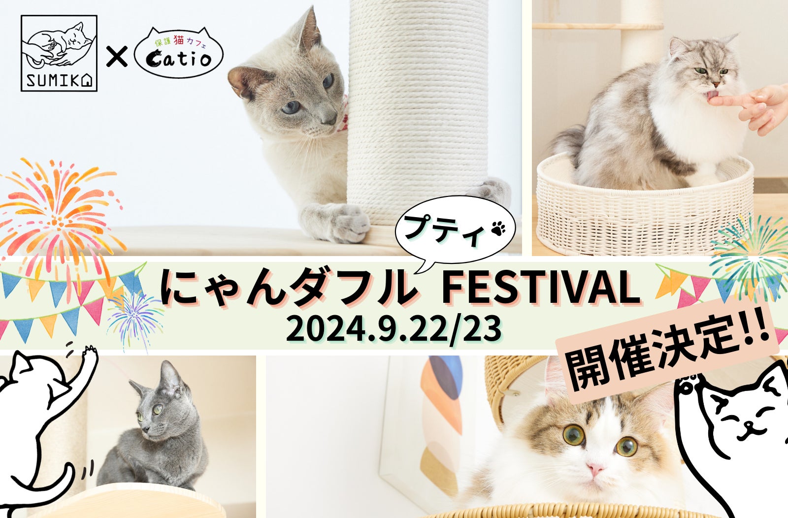 株式会社TIRAMISU(本社:東京都目黒区 代表取締役:高澤 匡 以下「当社」)が運営する 猫ぐらしブランド「キミとワタシのSUMIKA」(以下「SUMIKA」)は、2024年9月22日の秋分の日と9月23日の2日間に渡り、保護猫カフェCatio(東京都渋谷区 代表:矢萩 以下Catio)とのコラボイベント『にゃんダフル プティFestival』 開催します。