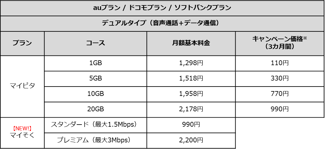 ※:料金は、auプラン・ドコモプラン・ソフトバンクプラン、また、デュアルタイプ(音声通話+データ通信)・シングルタイプ(データ通信のみ)を問わず共通です。