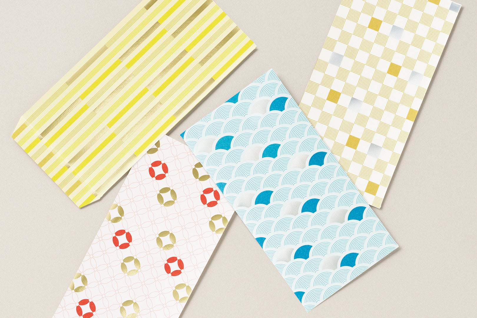 『こころもよう』は、日本の伝統紋様を現代的にアレンジしたデザインの万円袋です。ラインアップは「七宝」「縞」「青海波」「市松」の全4種です。鮮やかな色で表現した伝統紋様に箔押し加工を施し華やかな雰囲気に仕上げました。箔の輝きが特別感を演出しており、日常のやりとりから特別な場面まで、幅広いシーンで使用することができます。また、表書きが印刷されていないデザインのため、様々な祝いごとやお礼に使用することができる万円袋です。自分や贈る相手の好みで選んだり、伝統紋様に込められた意味や願いで選んだりと、利用シーンを問わず自由にデザインを選ぶことができます。
