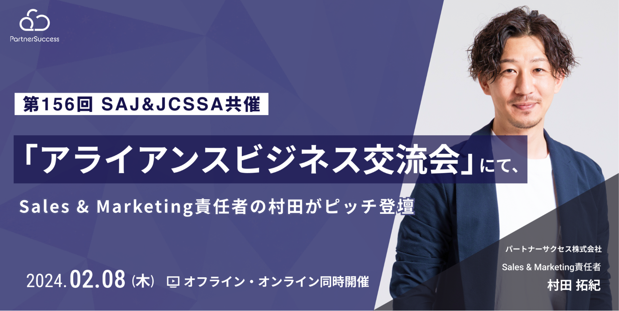 代理店販売で業績を伸ばすPRM(※1)-代理店連携管理クラウド「PartnerSuccess」を開発運営するパートナーサクセス株式会社(本社:東京都港区、代表取締役 永田雅裕、以下「パートナーサクセス」)は、2024年2月8日(木)に一般社団法人ソフトウェア協会(以下SAJ)と、一般社団法人日本コンピュータシステム販売店協会(以下JCSSA)共催の「アライアンスビジネス交流会」に登壇いたします。
