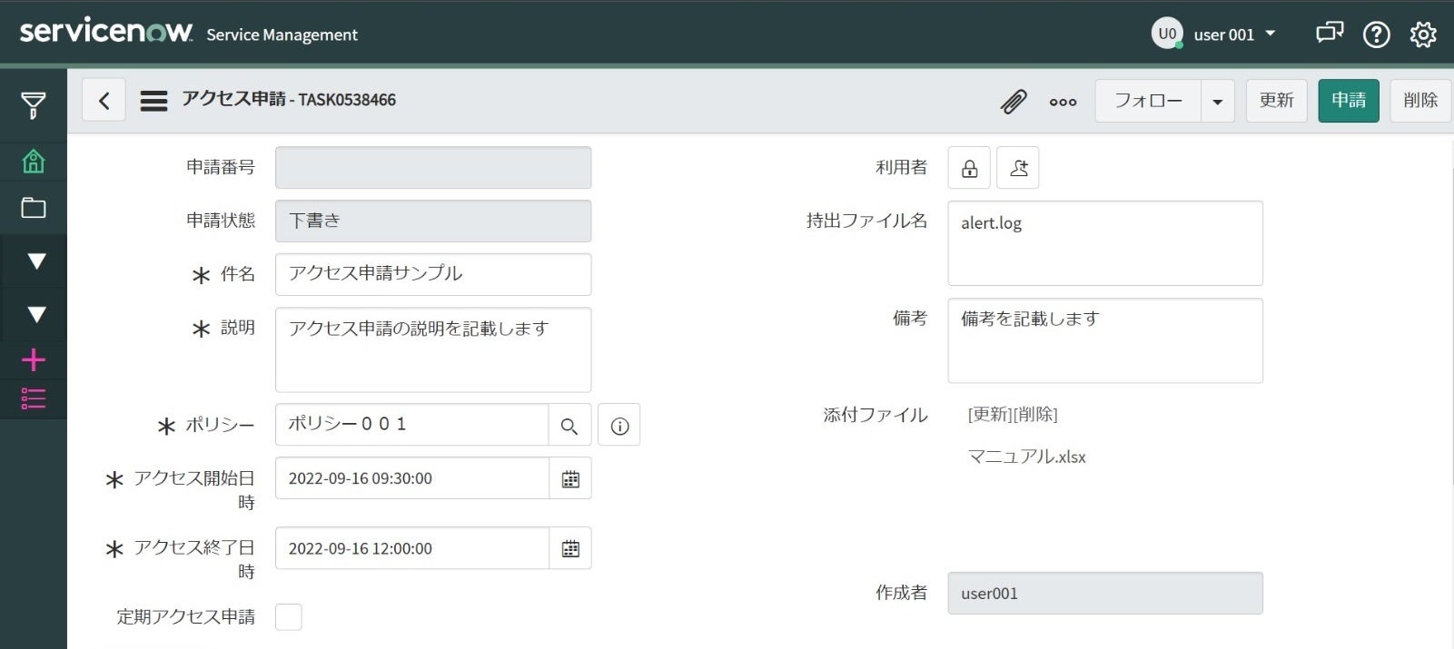 図2:ServiceNow IT Service Management上の特権IDの申請画面