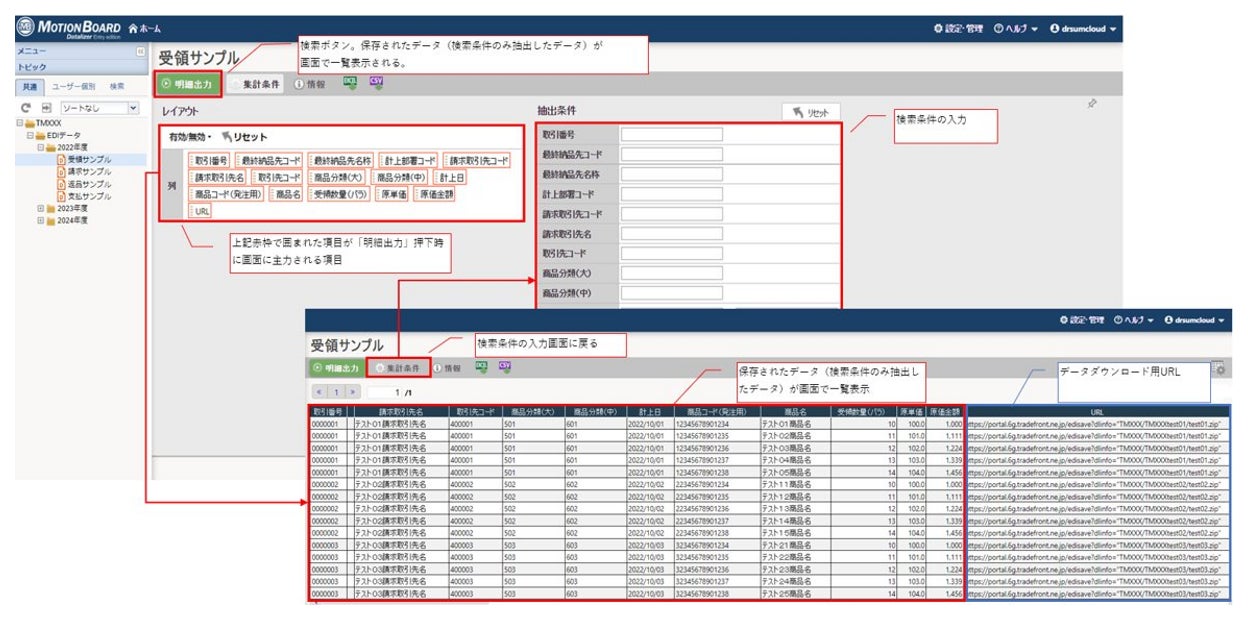 「Dr.Sum Cloud」が連携することで、サービスの利用者は電子取引データを「取引年月日」、「取引先名」、「取引金額」など電子帳簿保存法の検索要件の項目など、あらかじめ設定した項目(最大16項目)での検索・参照が可能です。またBIダッシュボード「MotionBoard Cloud」Entry Editionにより、これらの情報をレポート形式で集計・分析することができます。
