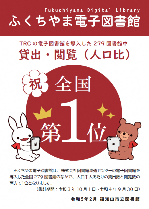 京都府福知山市立図書館が2022年1月20日に開設したインターネット上で24時間どこでも利用できる「ふくちやま電子図書館」が、株式会社図書館流通センター(TRC)の提供する電子図書館サービスを導入した全国279図書館のなかで、人口1000人あたりの貸出数と閲覧数の両方で1位となりました。