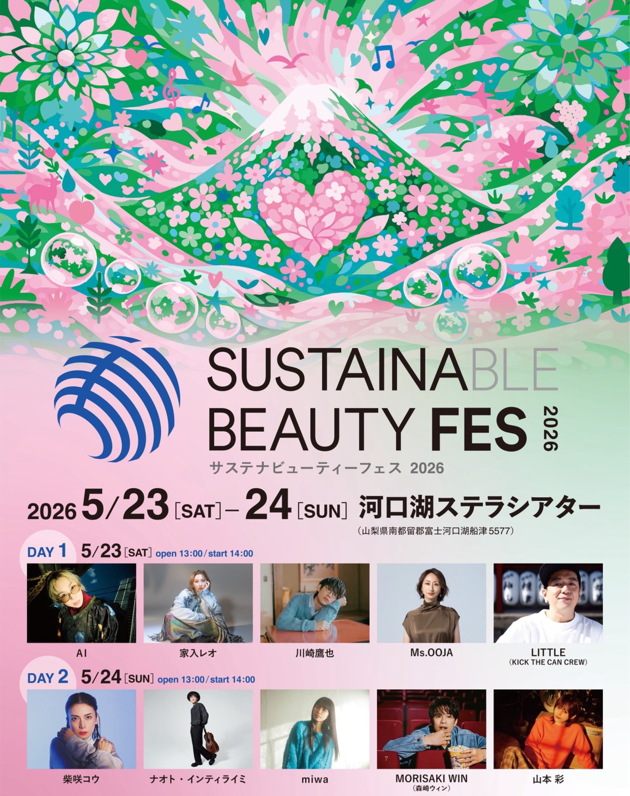 レトロワグラース株式会社(代表:柴咲コウ/本社:東京都渋谷区)は、2026年5月23日(土)・24日(日)の2日間、山梨県・河口湖ステラシアターにて開催する音楽フェスティバル「SUSTAINABLE BEAUTY FES 2026(サステナビューティーフェス2026)」の出演アーティスト最終発表として、Ms.OOJAの出演が決定し、全ラインナップが出揃いましたことをお知らせいたします。