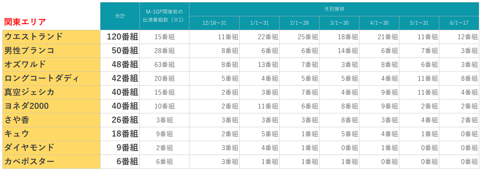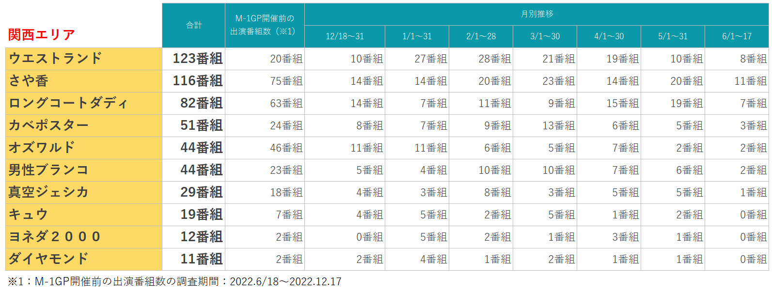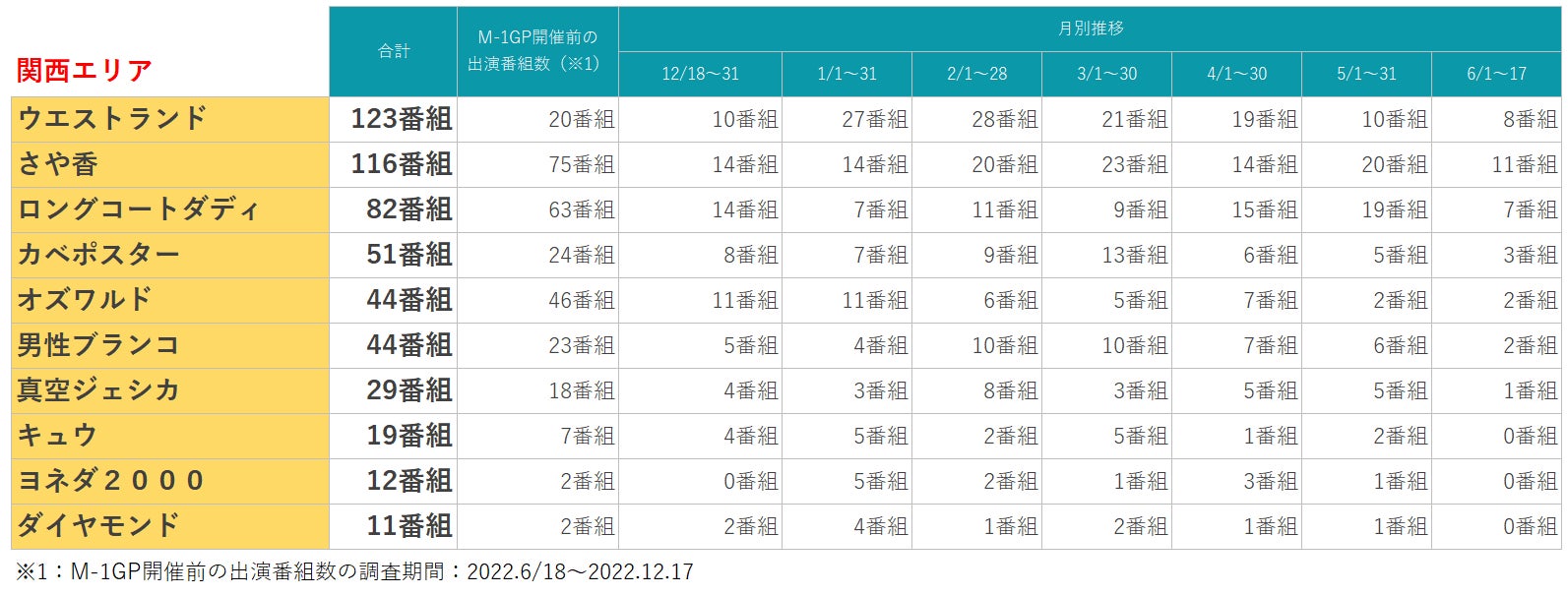 調査方法:「M-1 グランプリ 2022」決勝出場コンビ(※1)が、調査対象で放送されたテレビ番組へコンビで揃って出演(コンビのどちらかが単独で出演している場合は対象外)した番組数を集計し「総合、月別エリア別(関東/関西)」にてランキング。