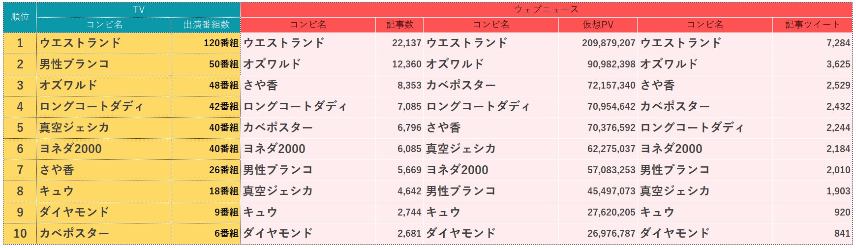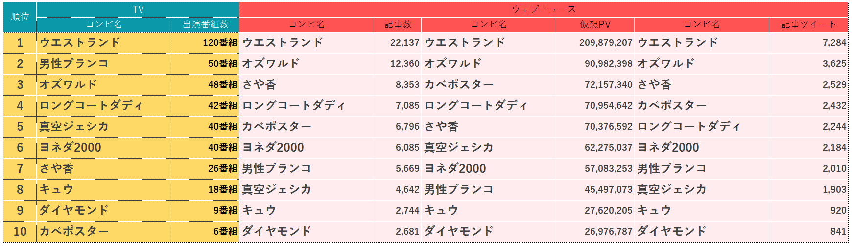 - ウエストランドがすべて1位(ウェブニュースの記事数・PV数・記事ツイート数、関東・関西のTV番組出演回数)。