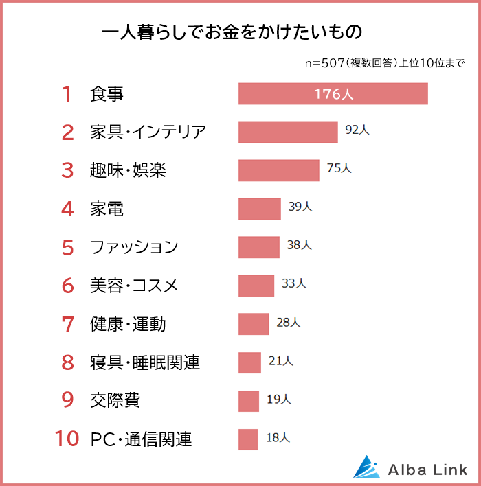 一人暮らしをしている507人に「一人暮らしでお金をかけたいもの」を聞いたところ、ダントツは「食事(176人)」で、2位以下を大きく引き離しました。2位「家具・インテリア(92人)」、3位「趣味・娯楽(75人)」、4位「家電(39人)」、5位「ファッション(38人)」と続きます。
