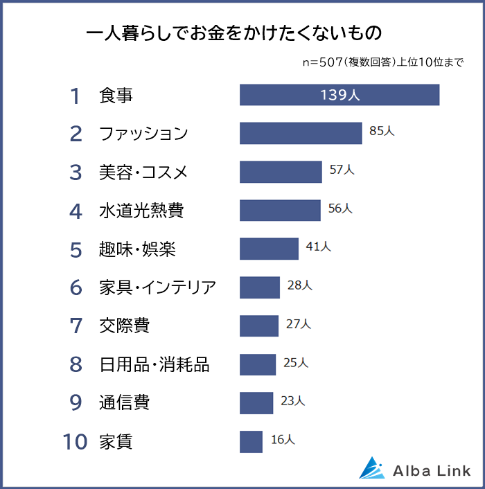 今回、株式会社AlbaLink( https://albalink.co.jp/ )が運営する訳あり物件買取ナビ( https://albalink.co.jp/realestate/ )は、一人暮らしをしている男女507人を対象に「一人暮らしでお金をかけたいもの&かけたくないもの」についてアンケート調査を実施しました。