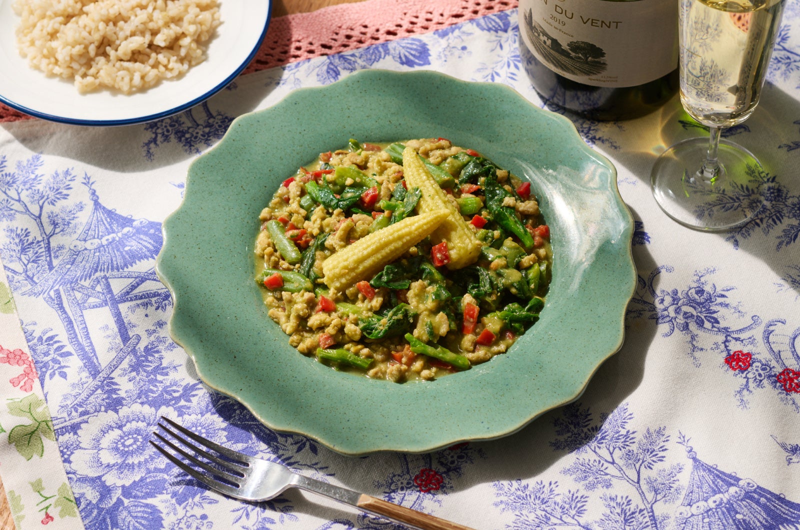 爽やかなレモングラスや青唐辛子の香りに、ココナッツの甘みが調和した本格エスニックカレー。ヤングコーンの食感やクラッシュアーモンドの香ばしさがアクセントの、大人好みのグリーンキーマです。