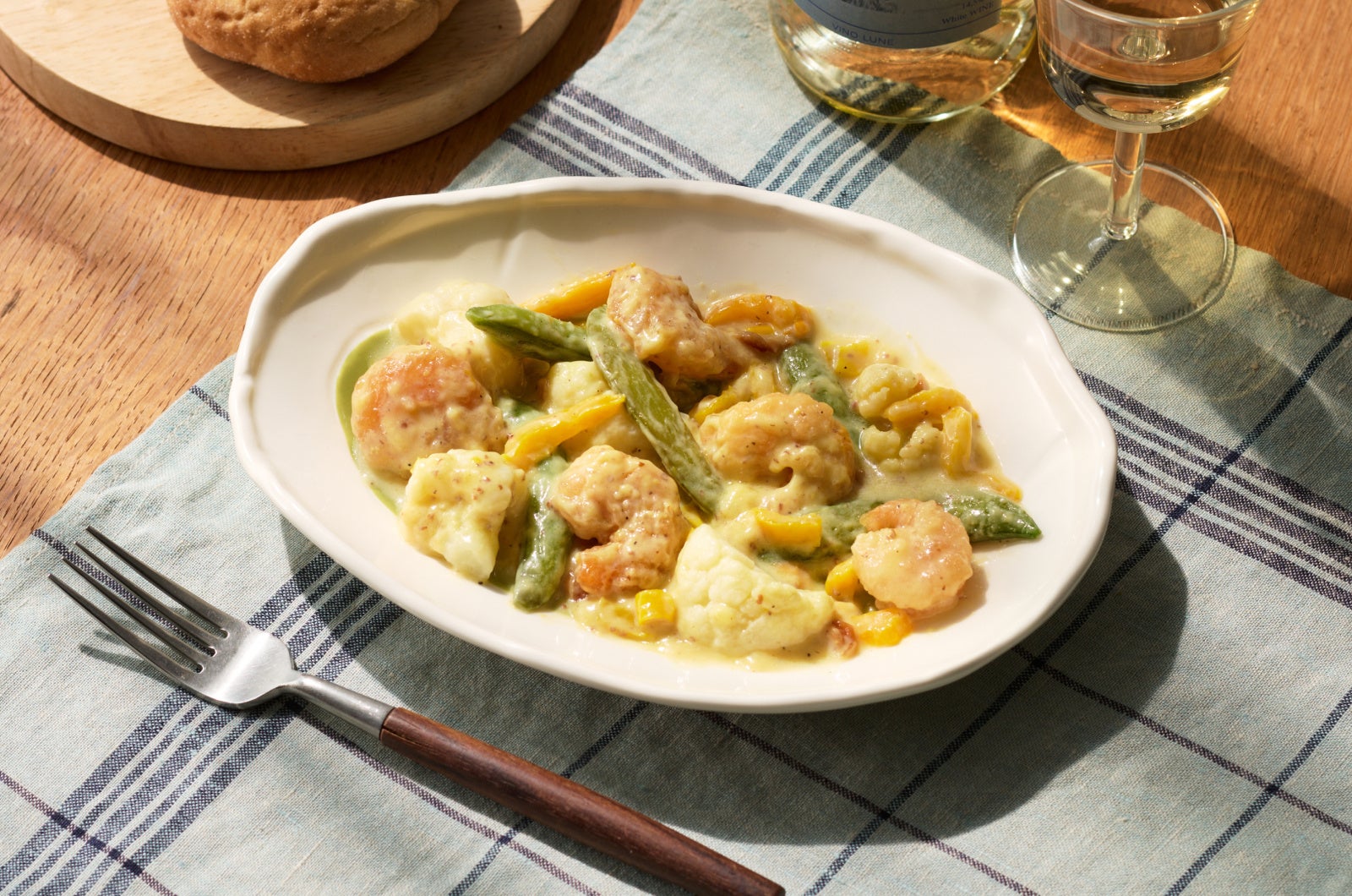 ぷりぷりのエビフリットにスナップエンドウやカリフラワー、黄パプリカなどの彩り野菜と、クリーミーで香りのよいマスタードソースを絡めた、大人のごちそうエビマヨ。食感がよい粒マスタードと上品な香りのフレンチマスタードをW使いし、贅沢なコクを引き出しました。
