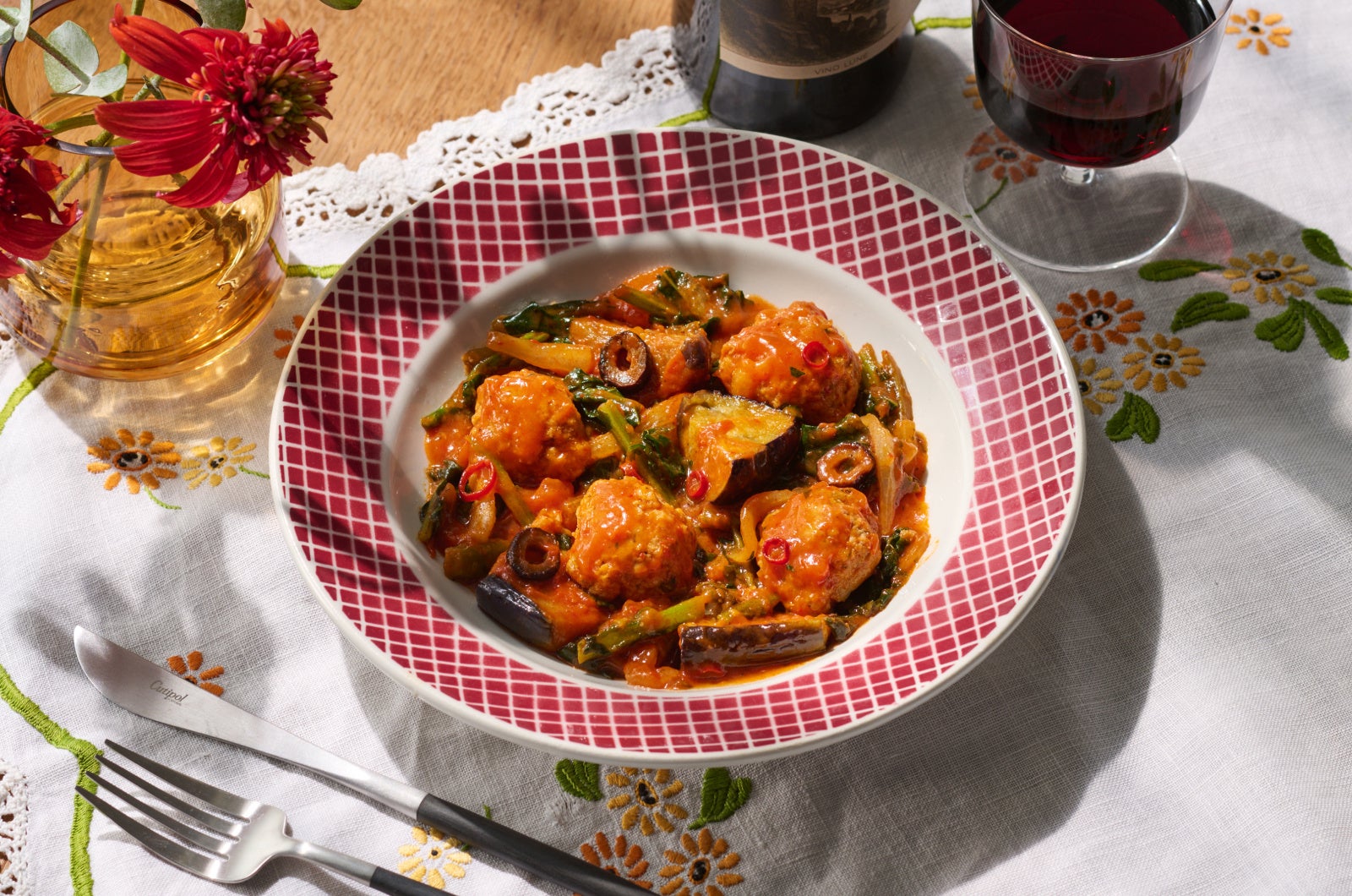 香り豊かなハーブミートボールに、ケールや揚げナス、ブラックオリーブを合わせ、特製のアラビアータソースで仕上げた洋風メニュー。唐辛子のシャープな辛味と風味豊かなガーリックが効いた大人の旨辛仕立てです。