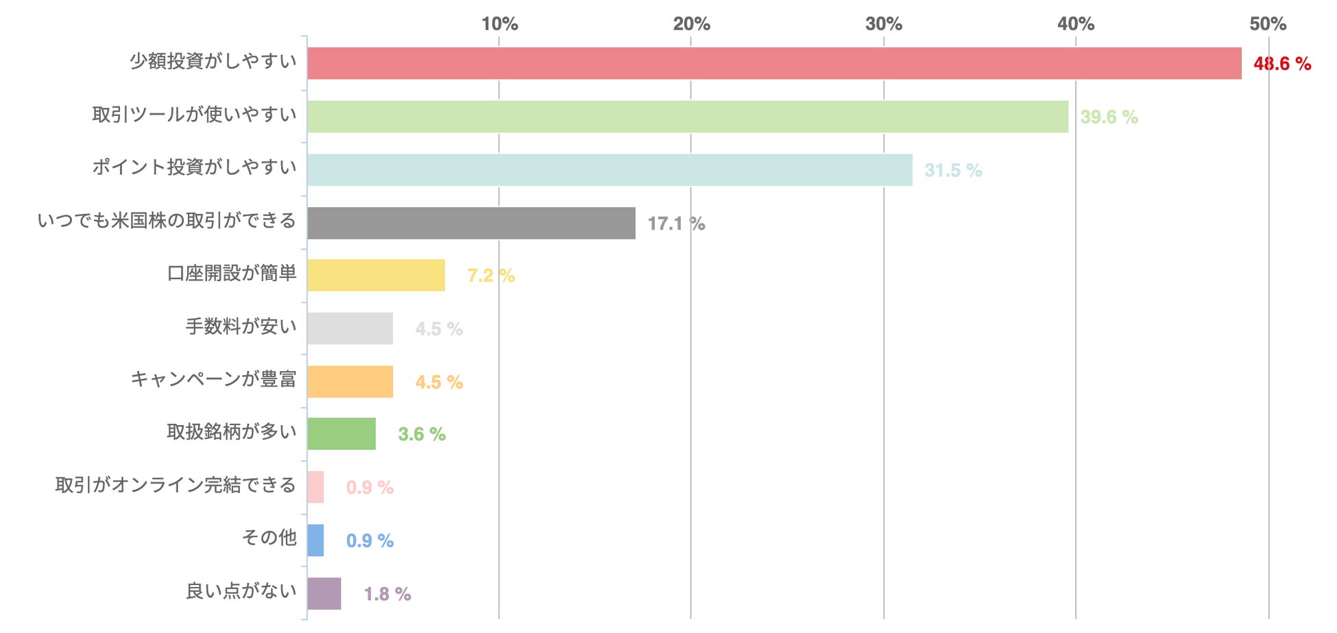 アンケートによれば、顧客が評価している主な点は、「少額投資のしやすさ(48.6%)」と「取引ツールの使いやすさ(39.6%)」であった。