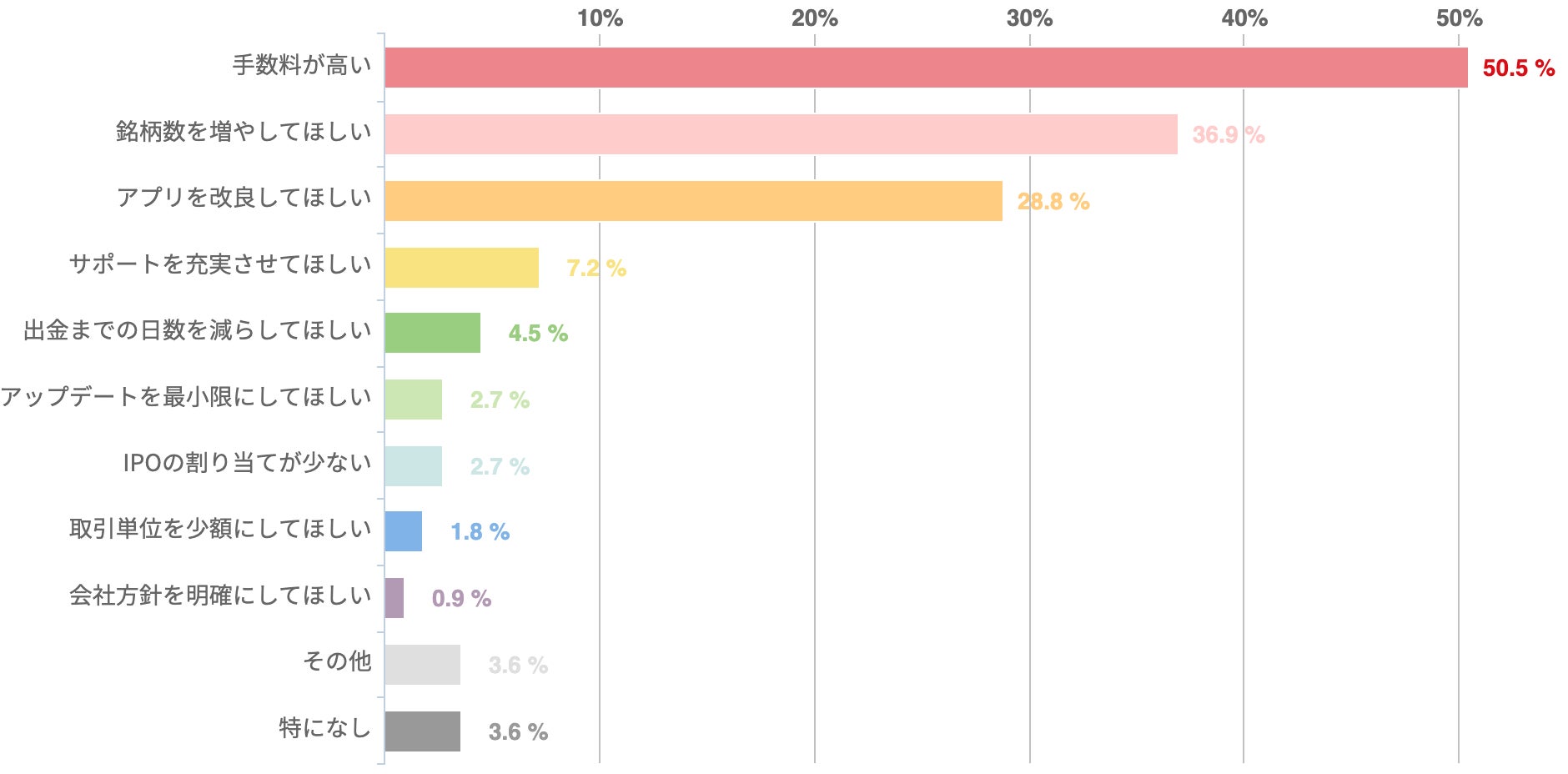 アンケートによれば、「手数料が高い(50.5%)」を不満に挙げた回答者が最も多かった。