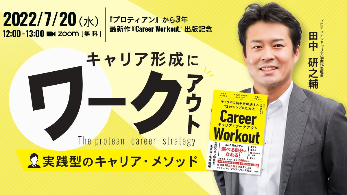 組織と個人のより良き関係性構築と個人の主体的なキャリア開発を支援する一般社団法人プロティアン・キャリア協会 (東京都新宿区、代表理事:田中研之輔・有山徹、以下、「当協会」)の代表理事、田中研之輔が、最新のプロティアン実践方法をお伝えするキャリア本「キャリアワークアウト(日経BP)」を7月15日に発売します。7月20日にどこよりも早く出版記念イベントを開催いたしますので是非ご参加下さい。