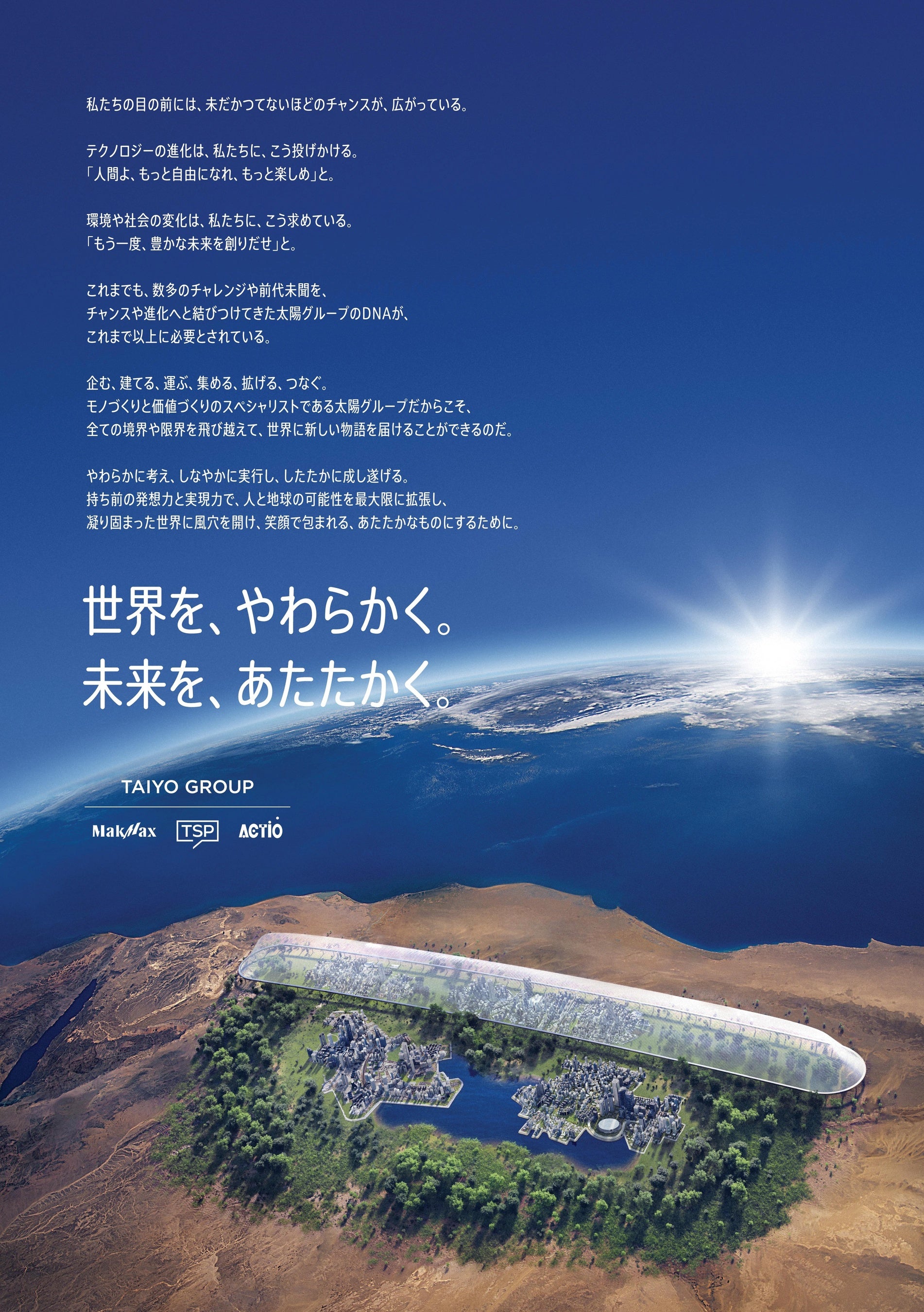 太陽グループは、テントで、イベントで、施設運営で、お客さまの課題に応えていくだけでなく、それぞれの事業を通して、「世界をやわらかくし、未来をあたたかくすることに貢献する企業グループ」を目指しています。