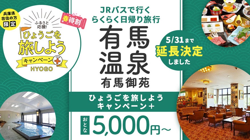 【5月31日迄延長!兵庫県民限定!】5,000円で往復JRバスで行く有馬温泉「有馬御苑」豪華な昼食付温泉入浴付き日帰り販売開始