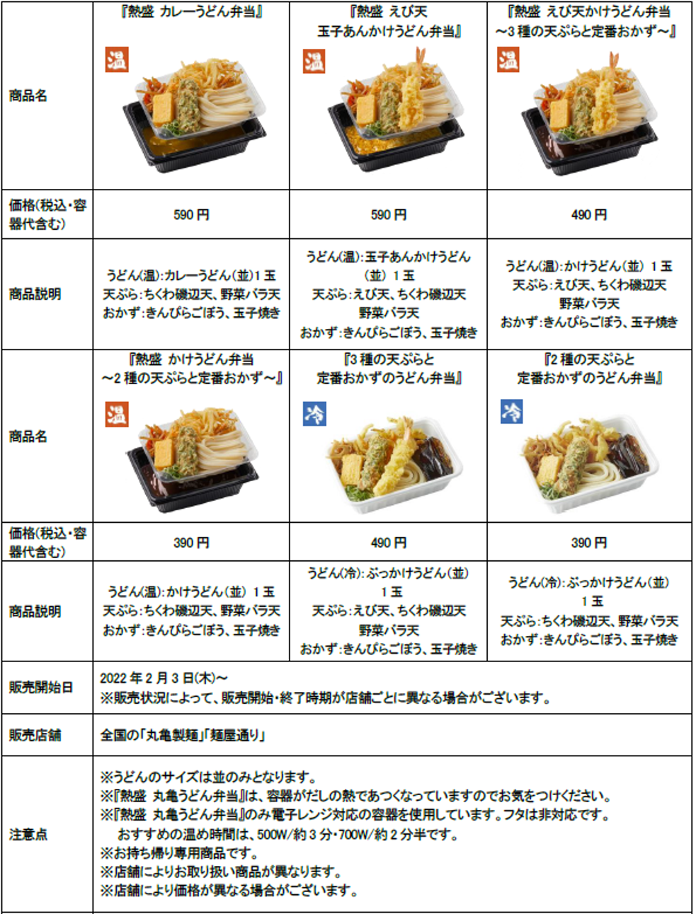 打ち立てあつあつのうどんで身体が温まる『熱盛 丸亀うどん弁当』と、つるつるとしたのど越しとコシを味わえる定番の『丸亀うどん弁当』の両方をご用意しております。その日の気分によってお好みで楽しんでいただけます。ぜひこの機会に、ご自宅やオフィスなどでお楽しみください。