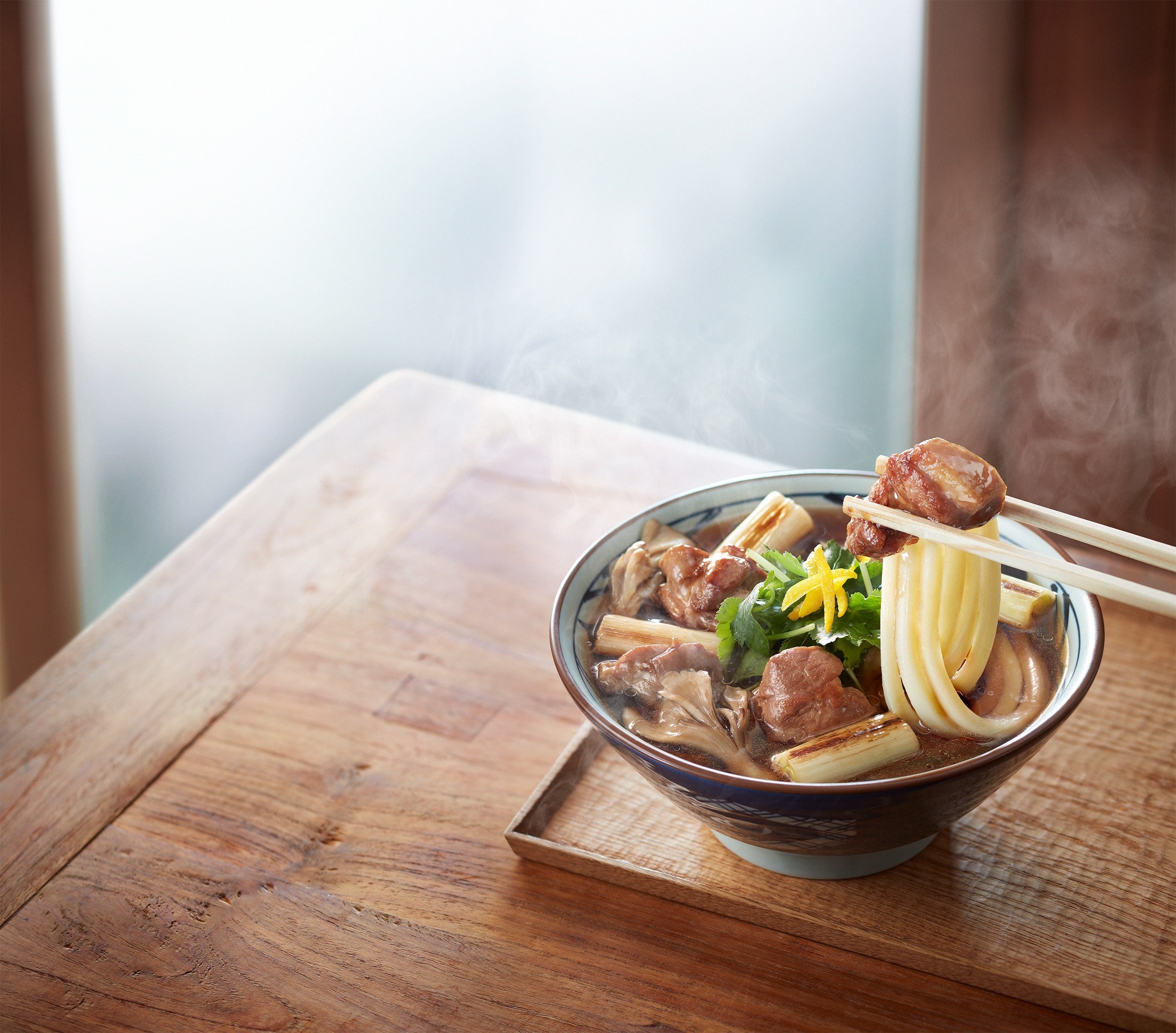 打ち立てうどんに、鴨のジューシーな旨みと香ばしい焼きねぎの甘み、香り高いまいたけ、具材の旨みが染み出た特製だしが絡み合います。寒い日に春をまつおなかと心をあたため、満たしてくれる贅沢な一杯です。ご注文をいただいてから一杯一杯つくるため、熱々でお楽しみいただけます。