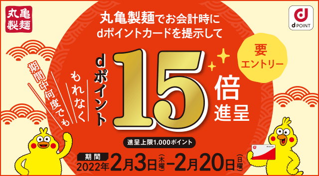 キャンペーン期間中にエントリー※1の上、丸亀製麺の店舗にてお支払いの際、「dポイントカード」「モバイルdポイントカード」「dカード®」「dカード GOLD®」「dカード プリペイド®」をご提示いただく、もしくは丸亀製麺のモバイルオーダーおよび「d払い」アプリ内「予約・注文サービス」の「丸亀製麺テイクアウト」で「dアカウント®」を連携の上、お支払いをいただくと、通常の15倍(100円につき15ポイント)のdポイントを進呈します。