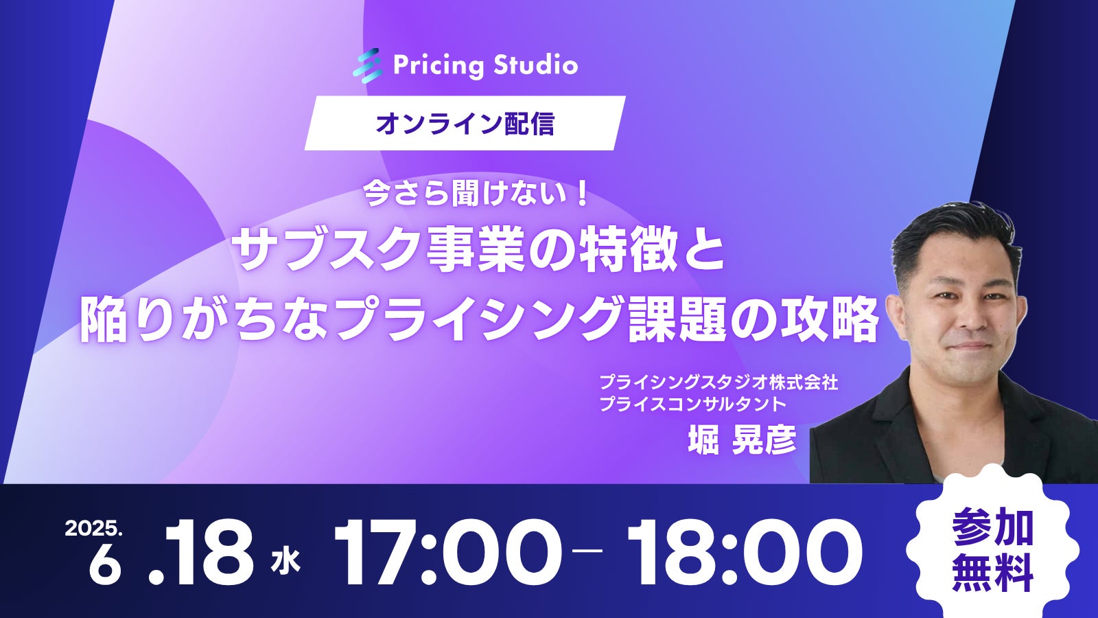 プライシングスタジオ株式会社(本社:東京都港区、代表取締役:高橋嘉尋)は、無料オンラインセミナー『今さら聞けない!サブスク事業の特徴と陥りがちなプライシング課題の攻略』を、6/18(水)17時に開催いたします。