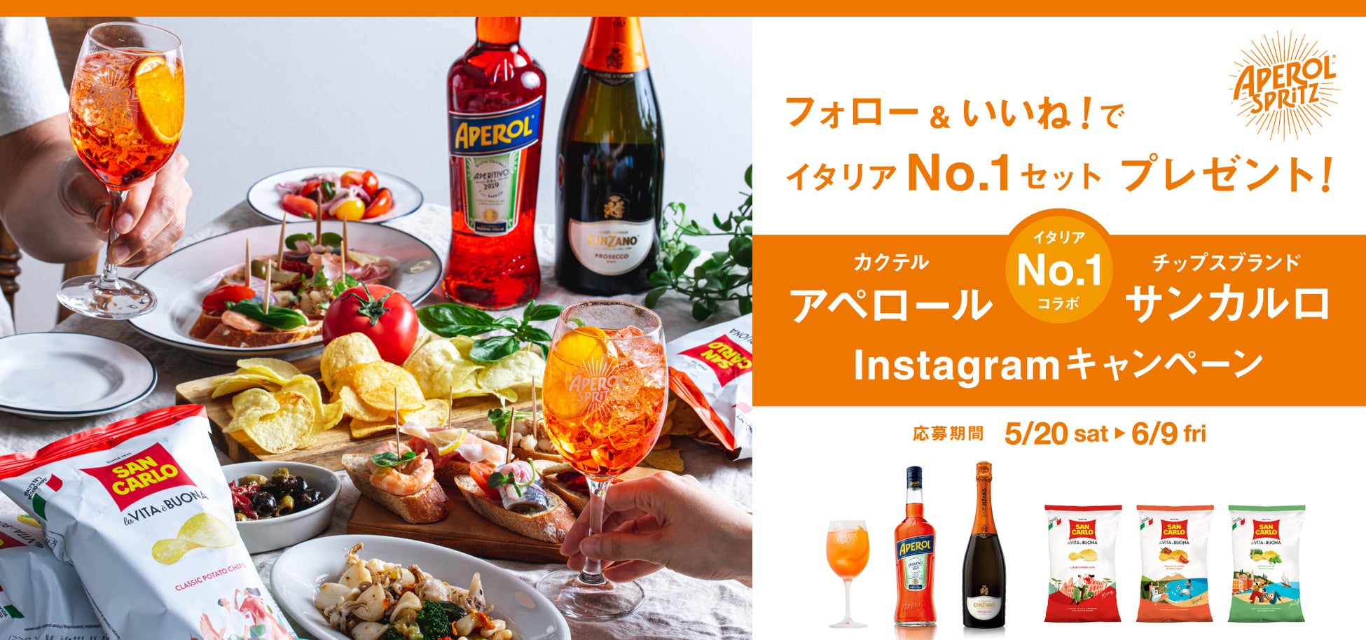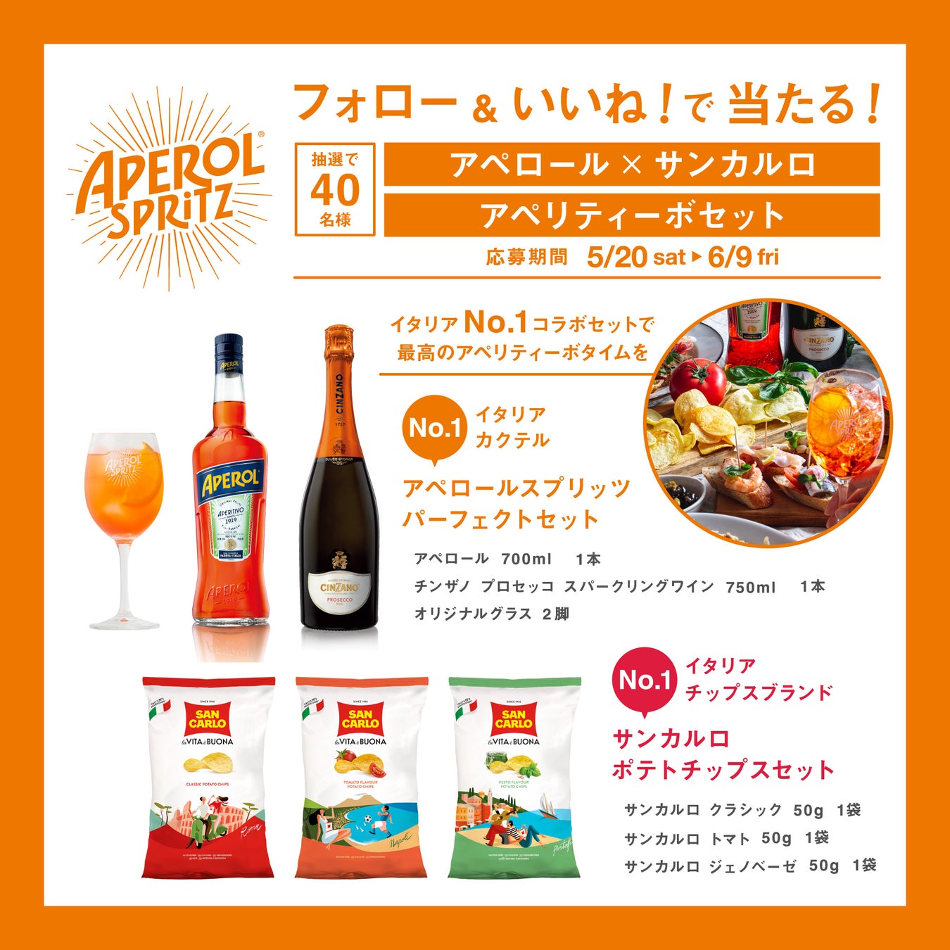 今回のキャンペーンでは、イタリアNo.1カクテル *「アペロールスプリッツ」とイタリアNo.1チップスブランド「サンカルロ」の、イタリアを代表する両ブランドから本場のアペリティーボが楽しめるスペシャルなギフトを抽選で40名様にプレゼントいたします。