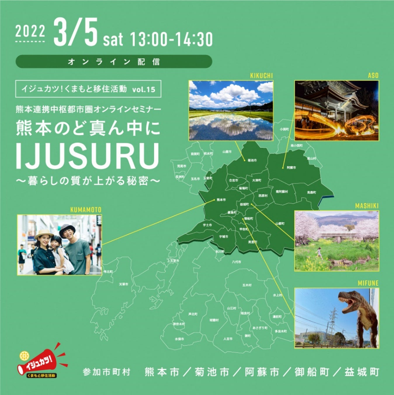 熊本連携中枢都市圏の5市町が地元の秘密を公開するオンラインセミナー「~暮らしの質が上がる秘密~熊本のど真ん中にIJUSURU」2022年3月5日(土)開催決定!