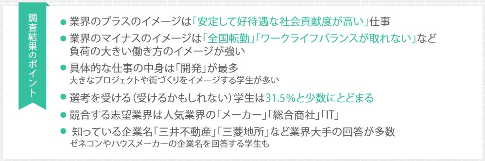 当調査では、この業界選択の際に判断の基礎となる「業界のイメージ」について学生にアンケートを行っています。今回の調査では、「不動産デベロッパー」について学生が持っているイメージを調査しました。