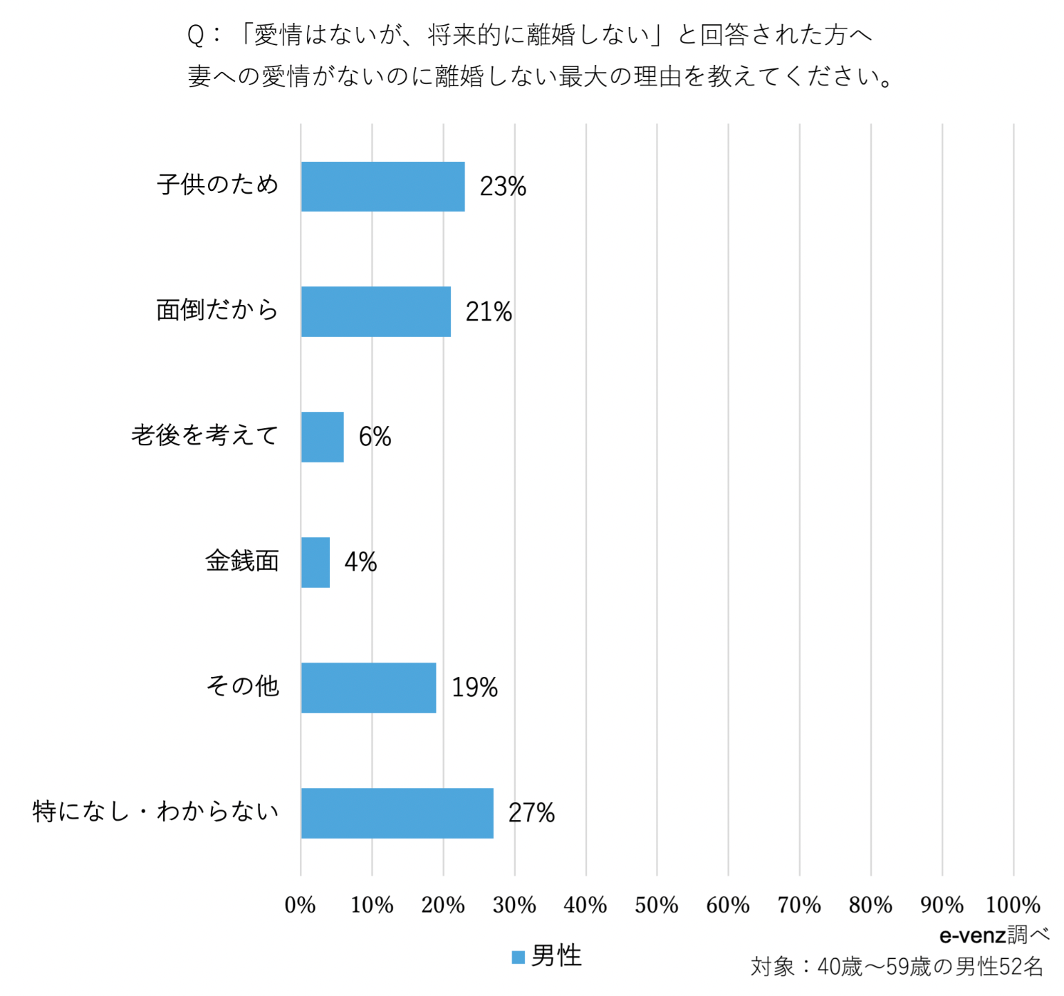 「愛情はないが、将来的に離婚しない」と回答した方に、妻への愛情がないのに離婚しない理由は何か調査してみました。