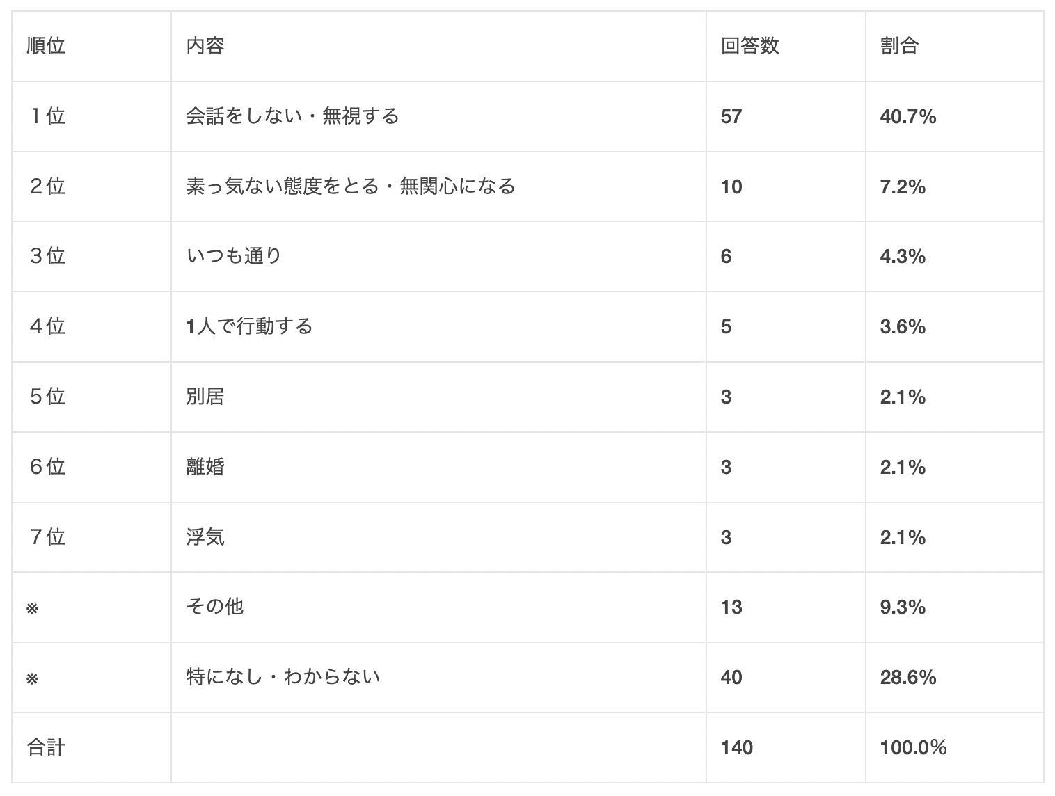 その他の回答として「1人で行動する」「別居」」「離婚」などの結果となっています。