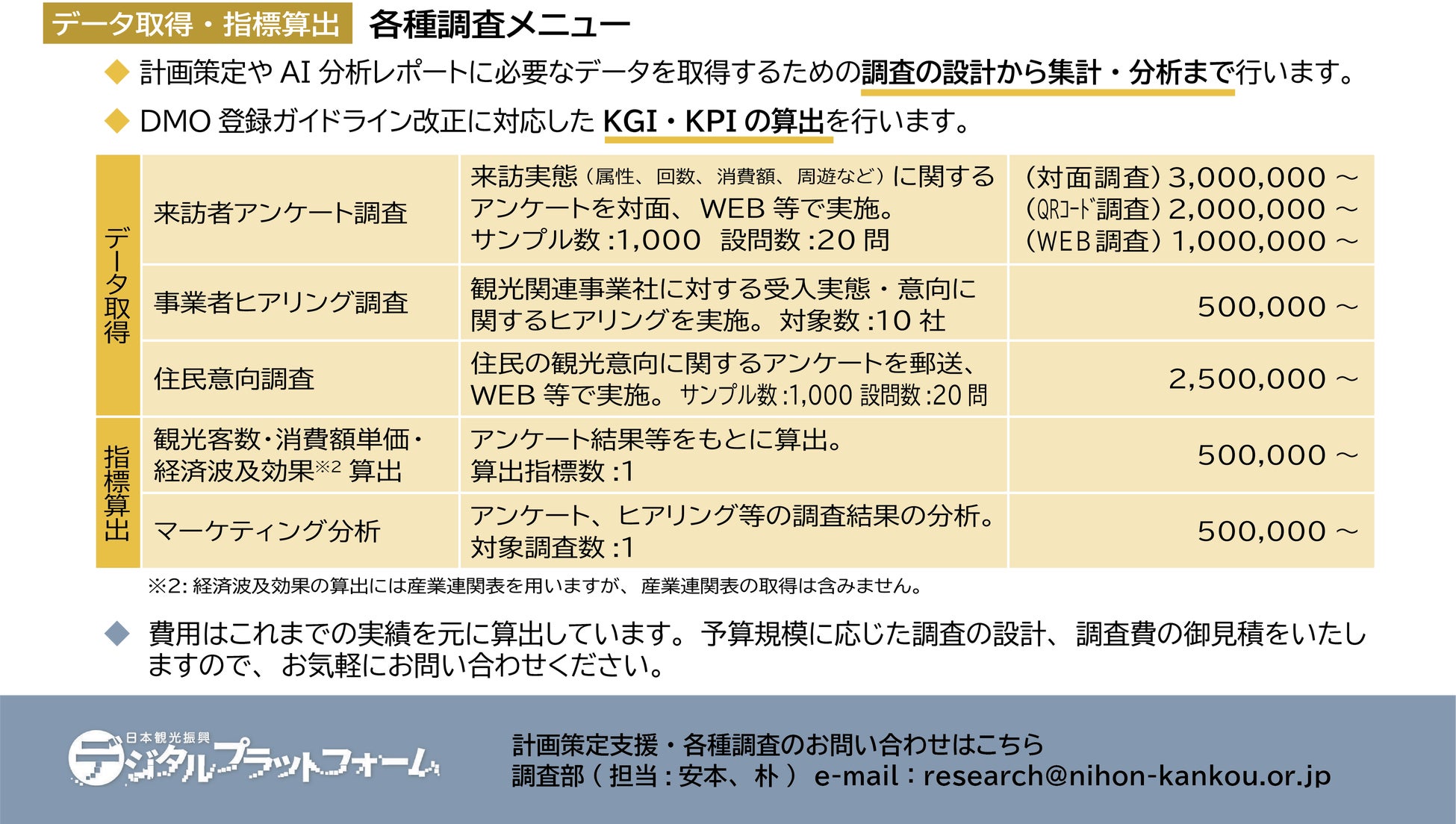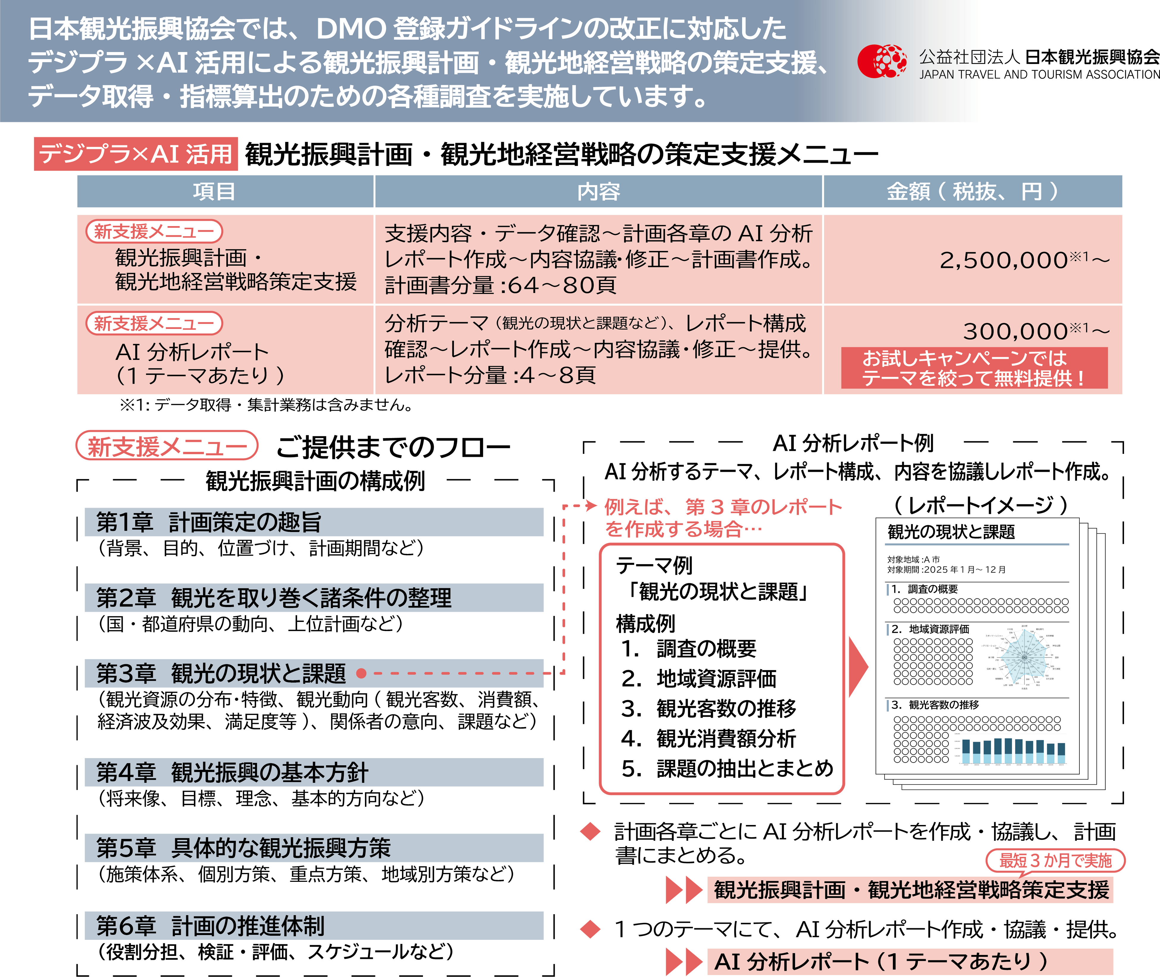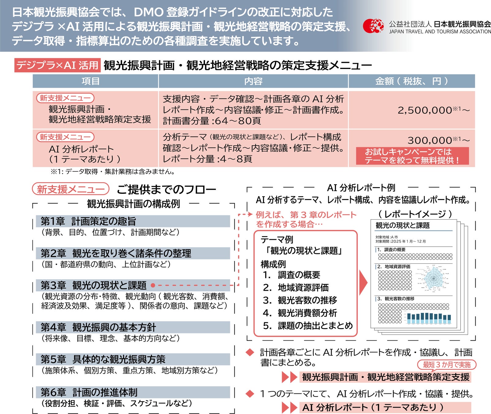 公益社団法人日本観光振興協会(本部:東京都港区 会長 菰田正信・三井不動産株式会社代表取締役会長)は、日本最大級の観光データ・マーケティングデータを搭載した「日本観光振興デジタルプラットフォーム(通称、デジプラ※)」において、60年以上培った観光振興計画策定のノウハウとAIのデータ分析を組み合わせた新支援メニューの提供を開始します。