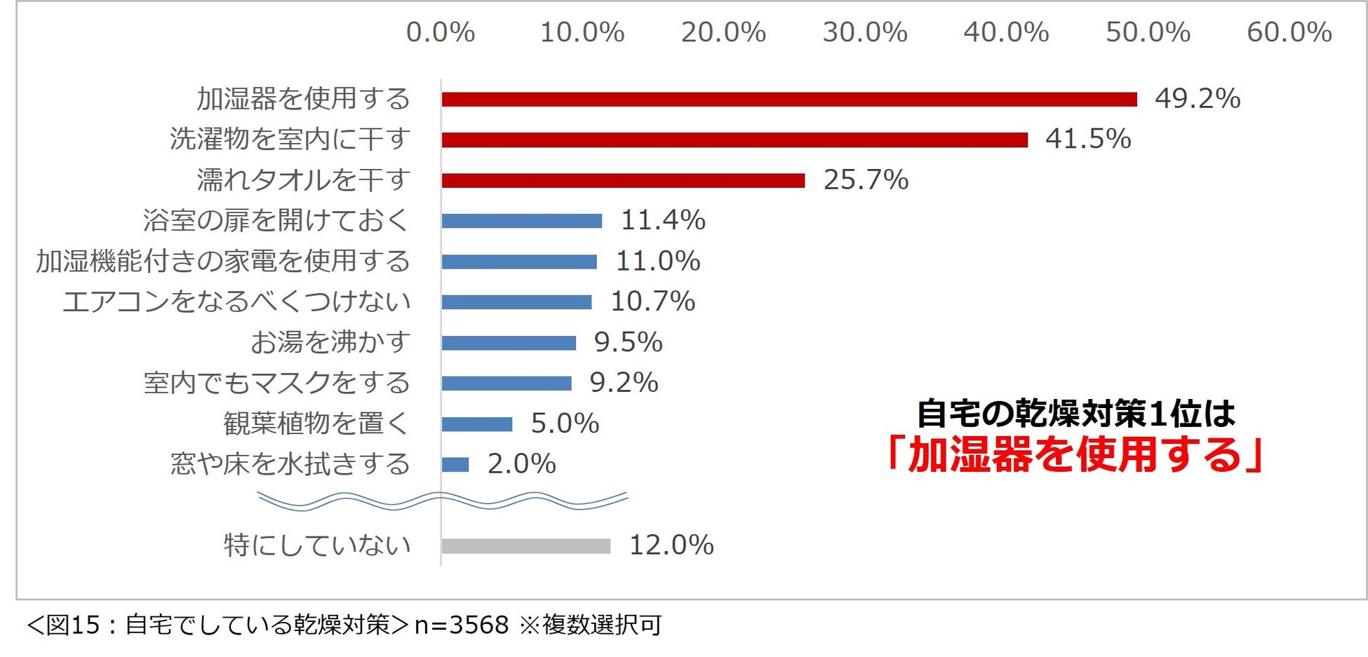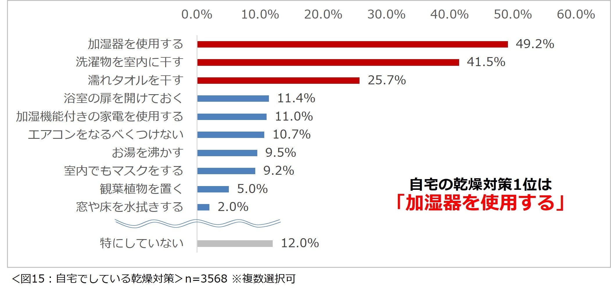「自宅の乾燥対策としてどのようなことを行っていますか?」と尋ねたところ、1位「加湿器を使用する」(49.2%)、2位「洗濯物を室内に干す」(41.5%)、3位「濡れタオルを干す」(25.7%)という結果になりました。(図15)