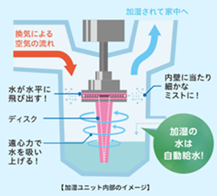 「ロスガード90うるケア」は、一条工務店とパナソニックが共同で実現した全館加湿&換気システム。加湿ユニットに自動給水された水を、回転する「ディスク」の遠心力によって吸い上げ、その水が水平に飛び出し内壁に当たることでナノサイズのミストが発生します。換気による空気の流れとともにミストが家中に行きわたり、自動で家中を加湿します。