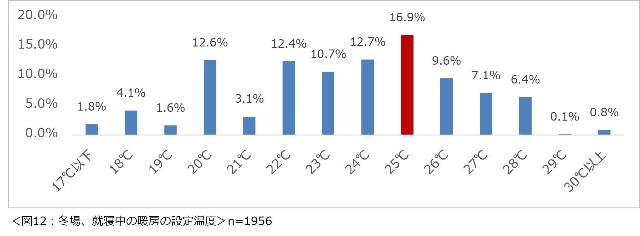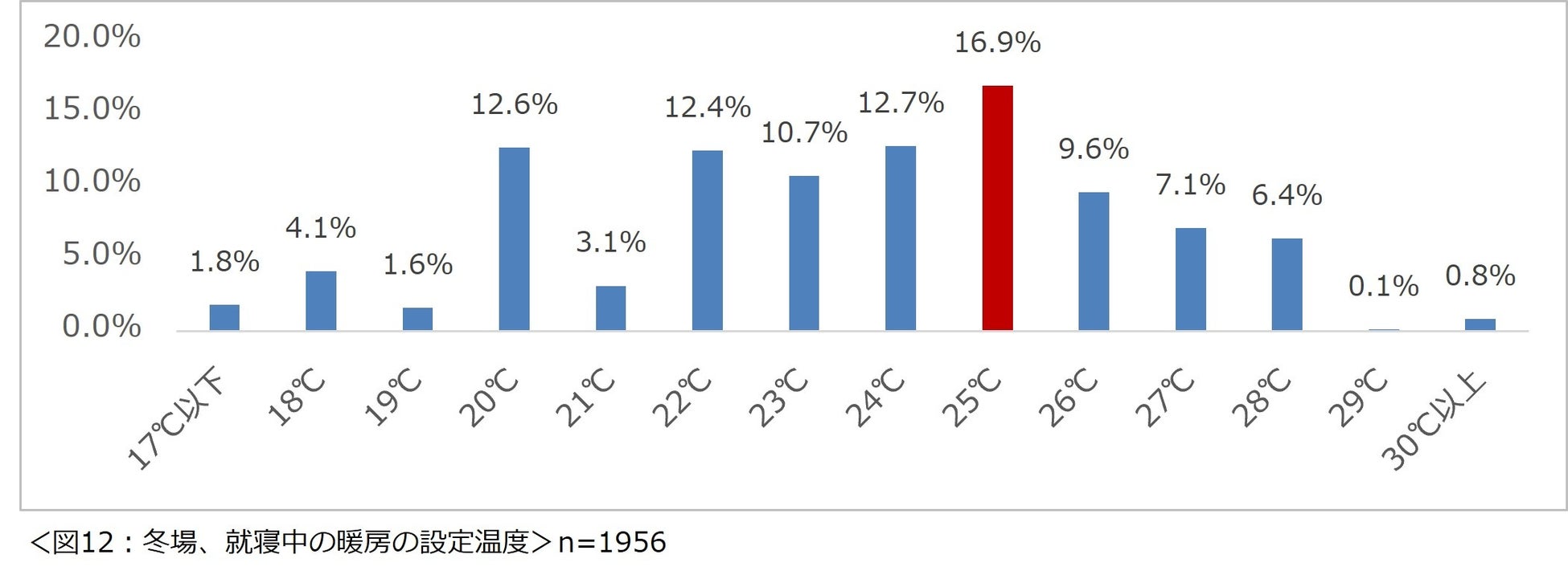 就寝中に寝室で暖房器具を使用しているという1956名に、「冬場、就寝中は暖房を何度に設定することが多いですか?」と尋ねたところ、最も多かった回答は「25℃」で16.9%という結果になりました。(図12)