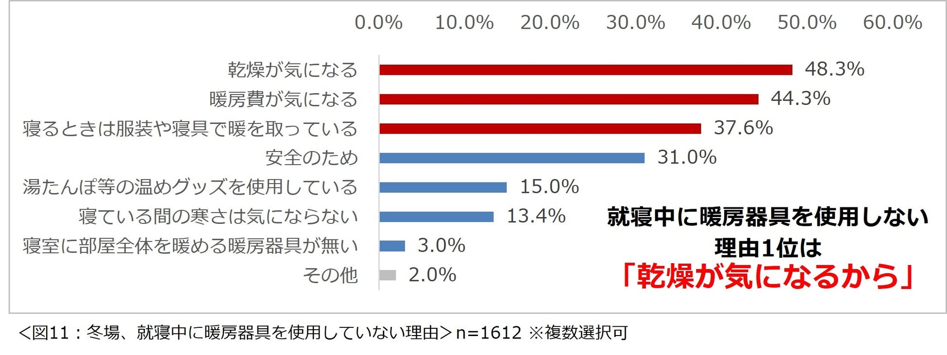 就寝中に寝室で暖房器具を使用していないという1612名に、その理由を尋ねたところ、1位「乾燥が気になるから」(48.3%)、2位「暖房費が気になるから」(44.3%)、3位「寝るときは服装や寝具で暖を取っているから」(37.6%)という結果になりました。(図11)