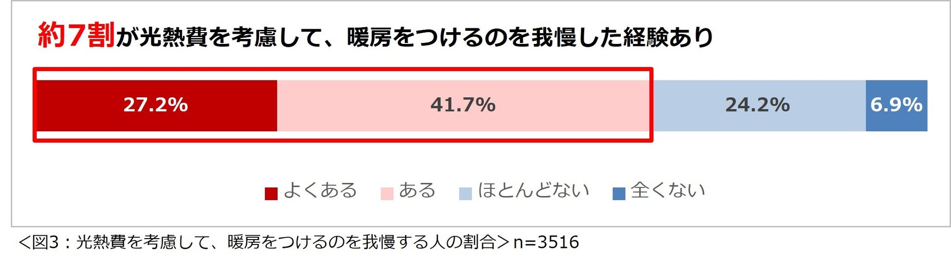 暖房を使用している3516名に、「光熱費を考慮して、暖房をつけるのを我慢することはありますか?」と尋ねたところ、「よくある」が27.2%、「ある」が41.7%で、合わせて約7割の人が、光熱費を考慮して、暖房をつけるのを我慢することがあることが分かりました。(図3)