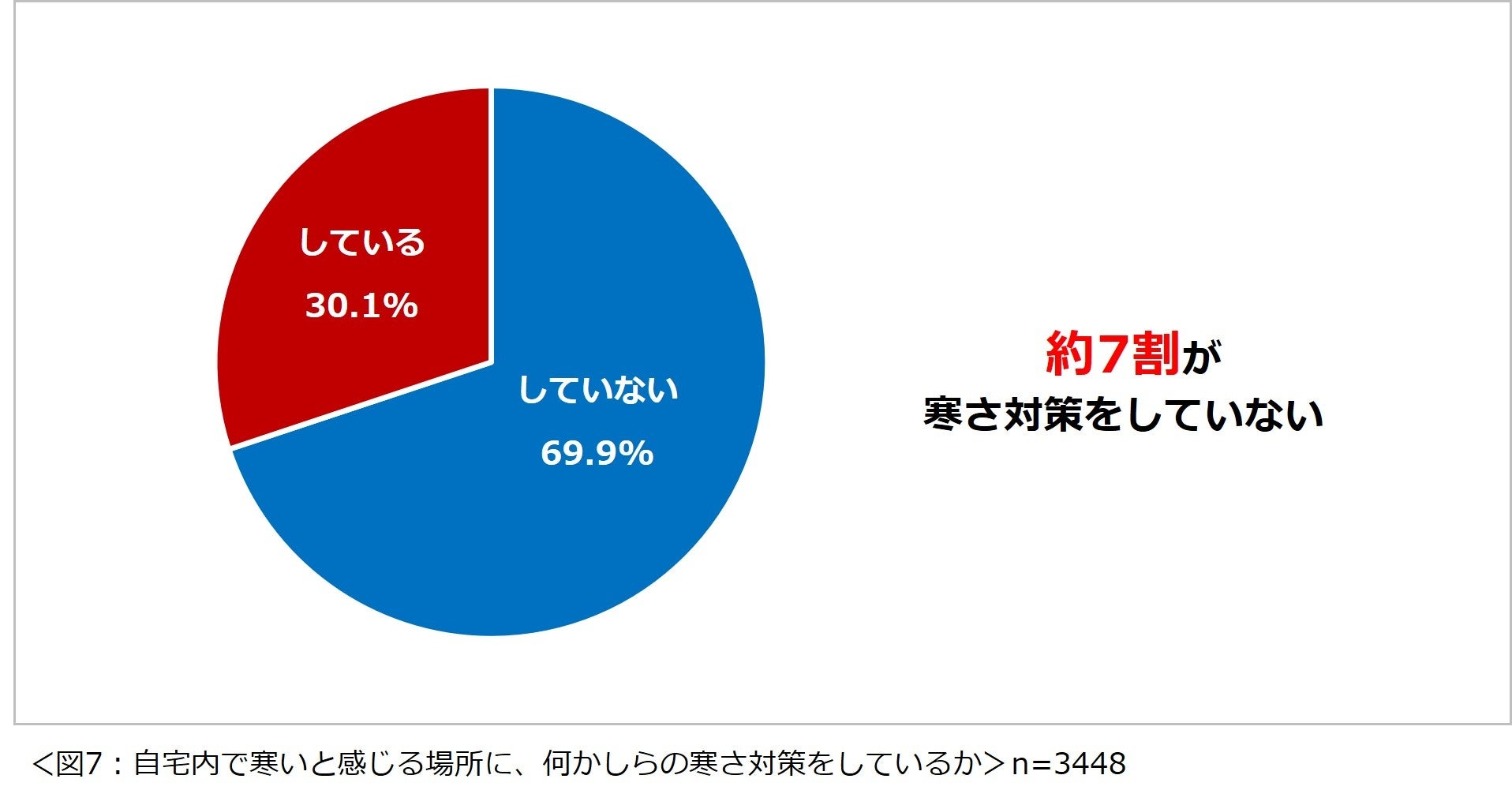 また、自宅内で寒いと感じる場所があると回答した3448名に、「寒いと感じる場所に何かしらの寒さ対策をしていますか?」と尋ねたところ、約7割の人が、何も対策をしていないことが明らかになりました。(図7)