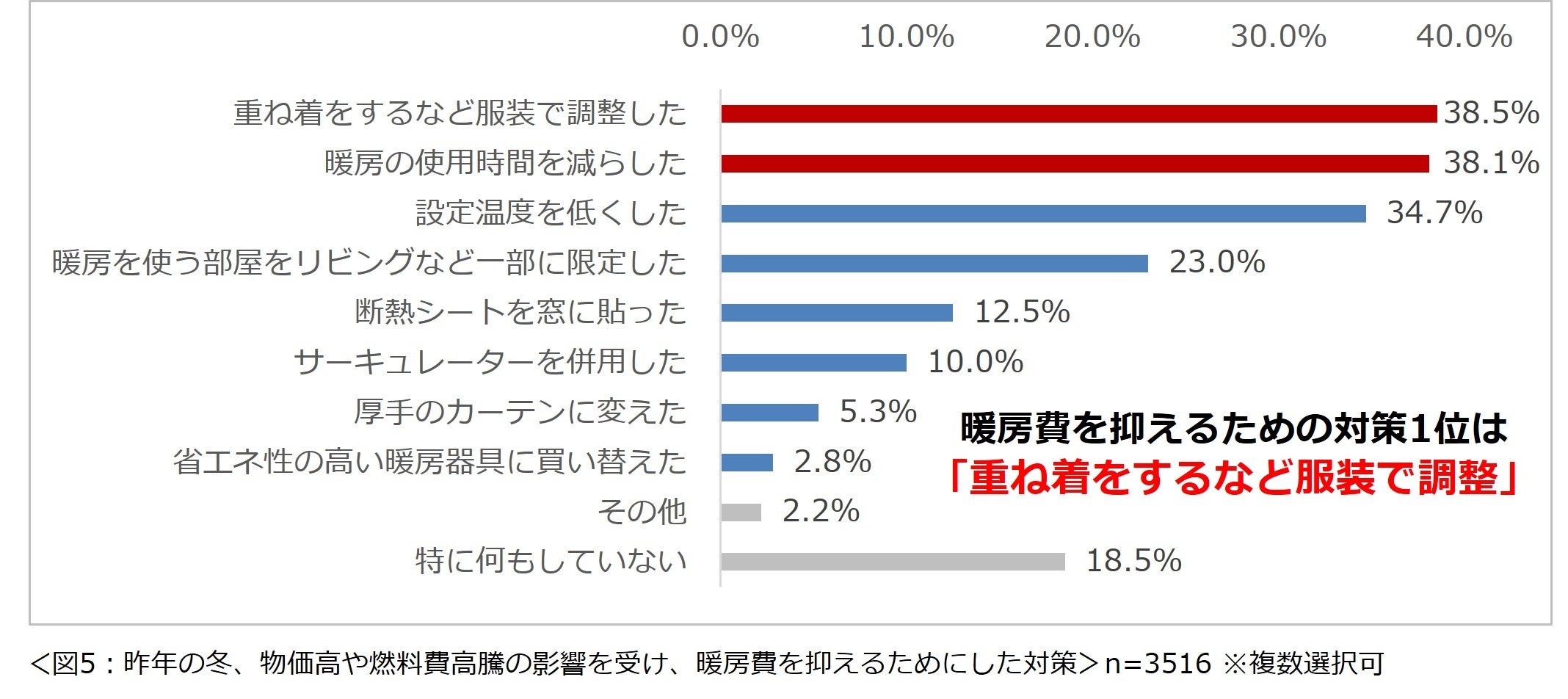 また、「昨年の冬、物価高や燃料費高騰の影響を受け、暖房費を抑えるための対策をしましたか?」と尋ねたところ、1位「重ね着をするなど服装で調整した」(38.5%)、2位「暖房の使用時間を減らした」(38.1%)と回答が続いた一方、特に何もしていない人も約2割いました。(図5)