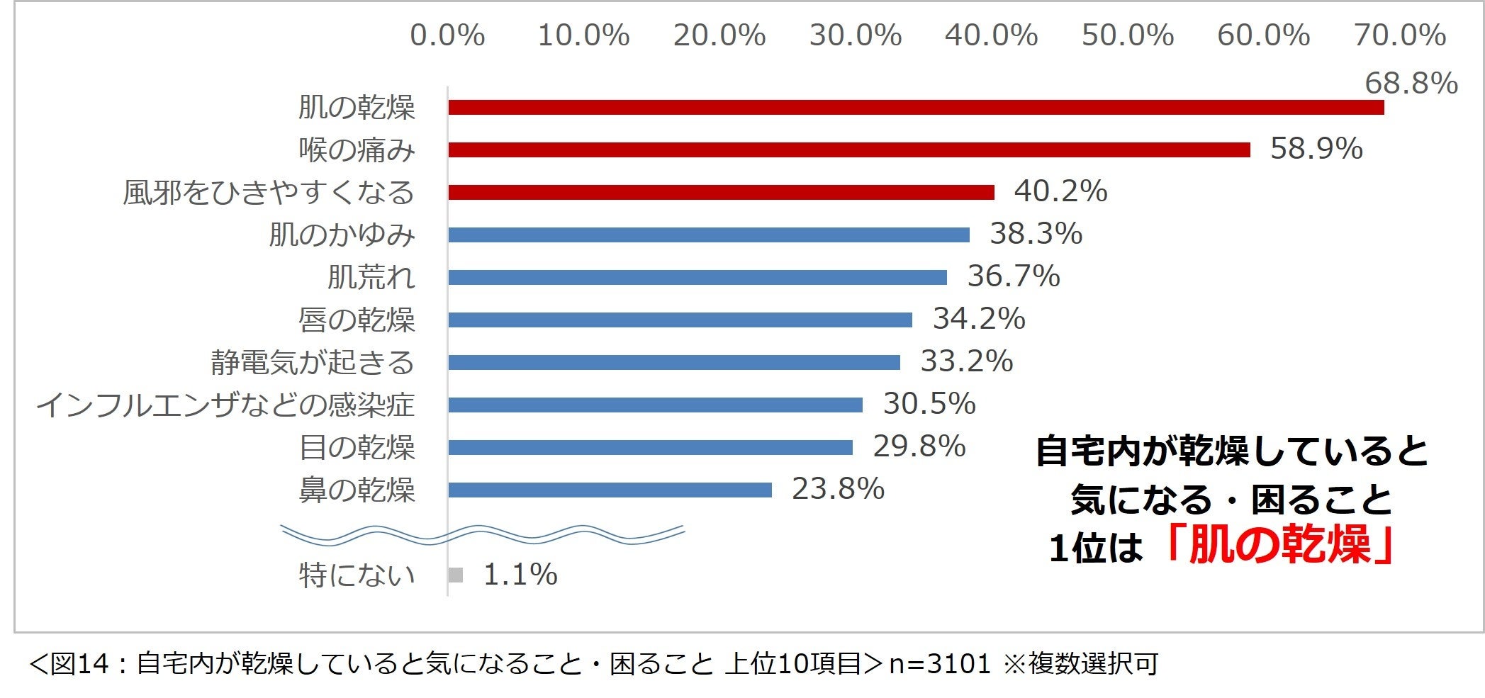 自宅内の乾燥が気になるという3101名に、自宅内が乾燥していると気になること・困ることについて尋ねたところ、1位「肌の乾燥」(68.8%)、2位「喉の痛み」(58.9%)、3位「風邪をひきやすくなる」(40.2%)という結果になりました。(図14)