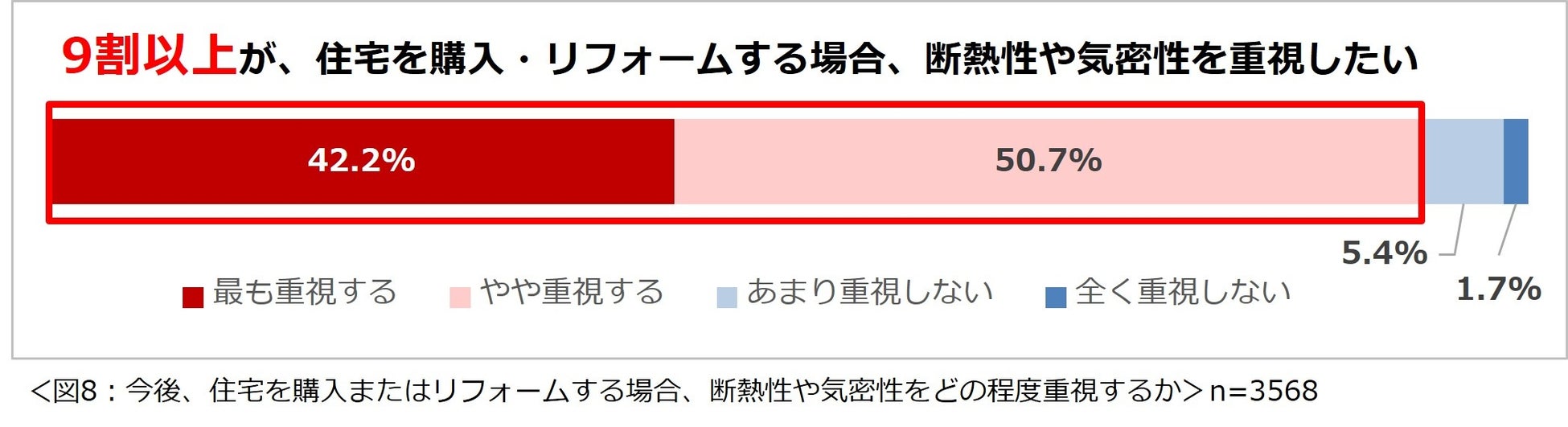 「今後、住宅を購入またはリフォームする場合、断熱性や気密性をどの程度重視しますか?」と尋ねたところ、「最も重視する」が42.2%、「やや重視する」が50.7%で、合わせて9割以上の人が、断熱性や気密性を重視したいと思っていることが分かりました。(図8)