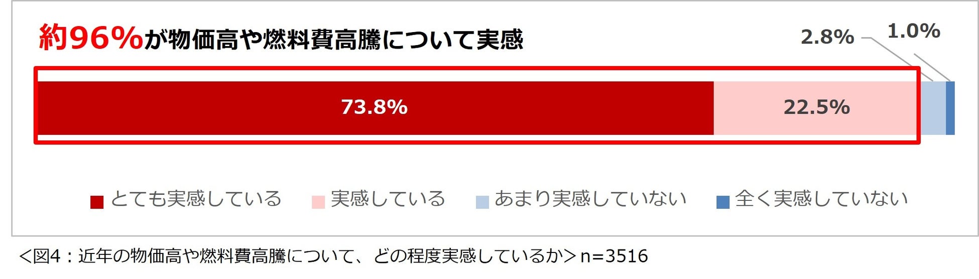 約96%の人が、近年の物価高や燃料費高騰について実感している。