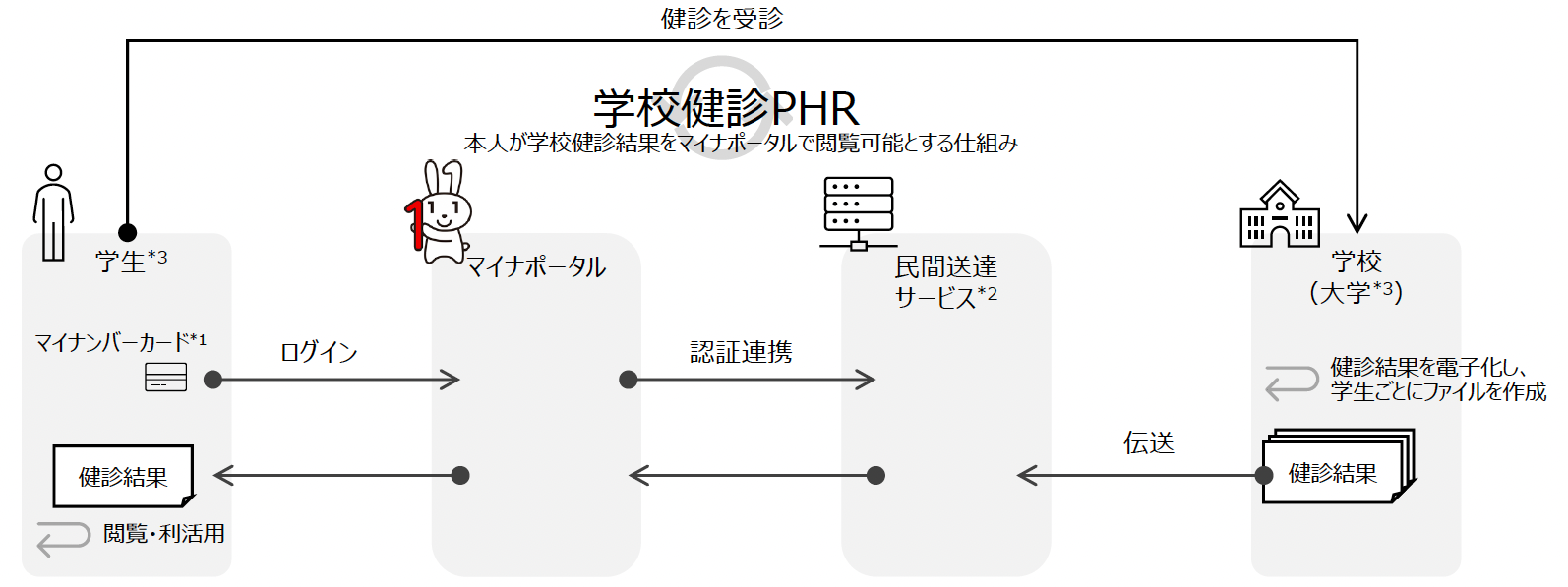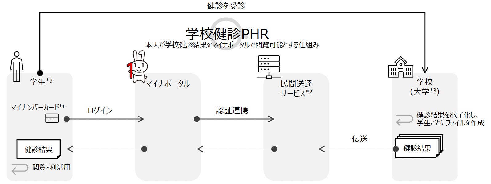 ※1:学校健診PHRの仕組みにおいて、マイナンバーカードを用いることは想定しないため、マイナンバー自体を大学関係者が取り扱うことはありません。