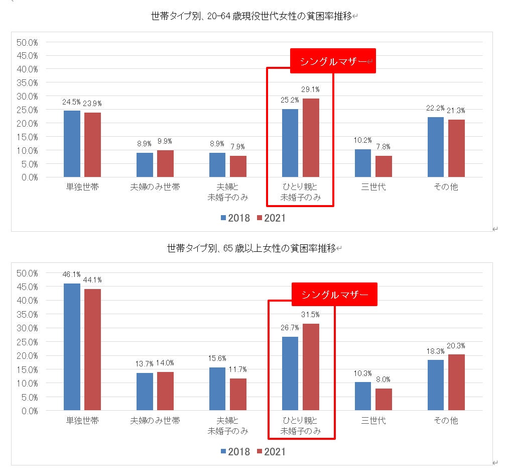 厚生労働省の「2022年 国民生活基礎調査」による相対的貧困の基準は世帯年収127万円とされ、相対的貧困率は15.4%に達しています。(注2)つまり日本人口の6人に1人程度、約2,000万人が貧困状況での生活を余儀なくされています。また、2018年から2021年の間に「女性ひとり親と未婚子のみ(シングルマザー)」世帯の貧困率が突出して増加しています。(注3)20~64歳の現役世代では、25.2%(2018年)→29.1%(2021年)、65歳以上の高齢者世代では、26.7%(2018年)→31.5%(2021年)。シングルマザーにおける貧困の状況は、より悪化しているといえます。