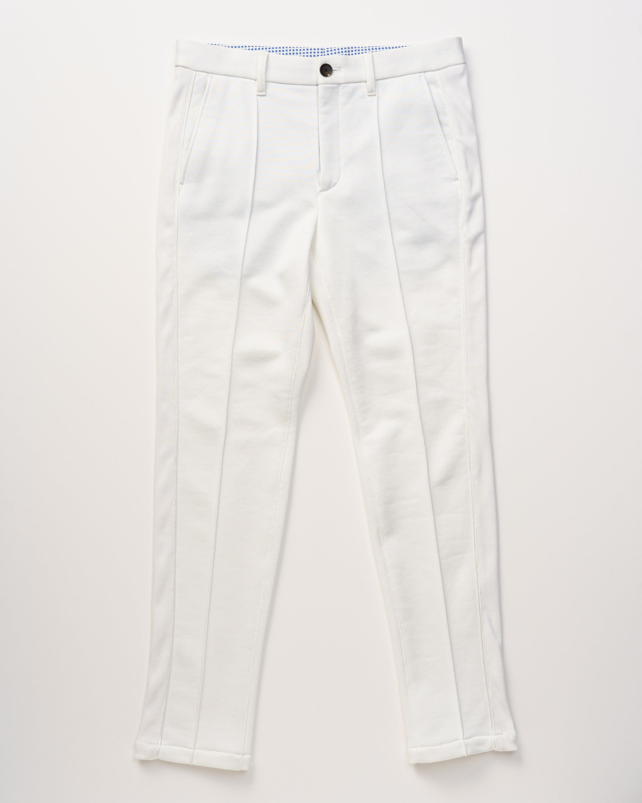 ディテールもシルエットもドレッシーなスラックスパンツを裏毛素材で快適に表現。ドレッシーさは内側にも及び、マーベルト仕様で高級感をプラス。サイドにリブを施すことで細身なシルエットに快適さをプラス。センタープレス位置はステッチでつまむことによりドレッシーなイメージをキープ。
